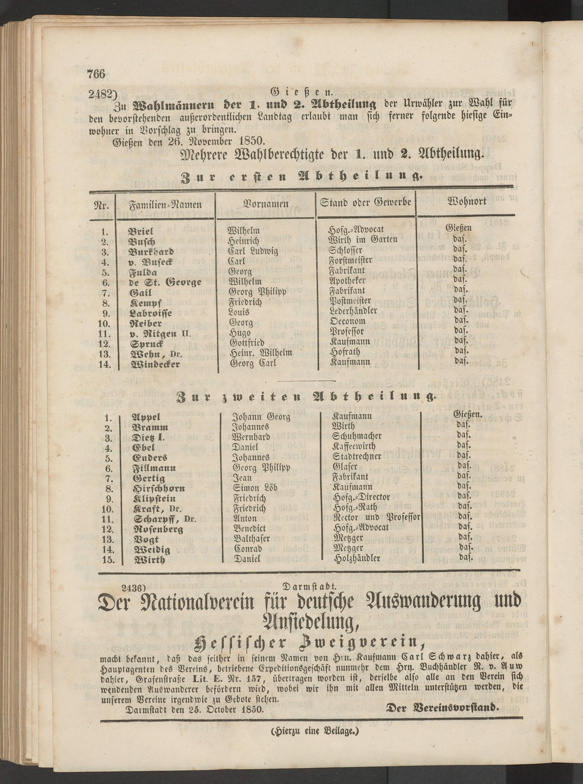 Zu Wahlmärmeru der 1. und 2. Abtheilung der Urwähler zur Wahl für den bevorstehenden außerordentlichen Landtag erlaubt man sich ferner folgende hiesige Einwohner in Vorschlag zu bringen.