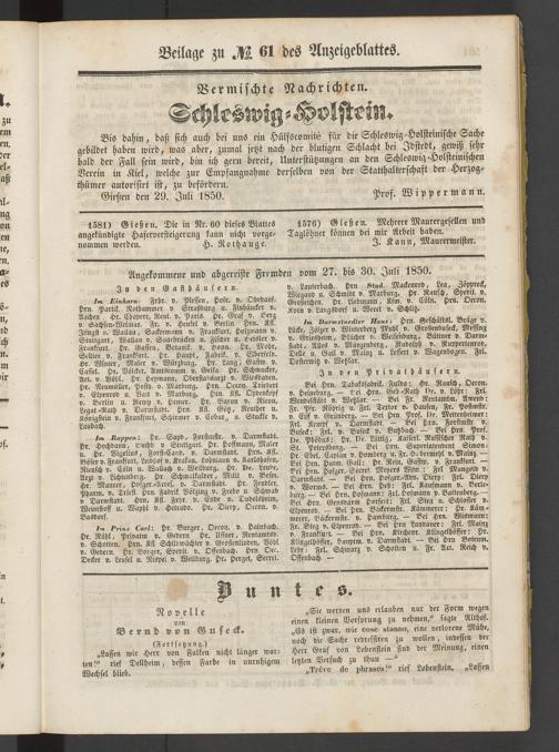 v Lauterbach. Hrn Stud. Mackenrod, Lea, Zöppreck, Wiegand u. Schmidt v. Marburg, Hr. Rausch, Spedit. v. Großeichen. Hr. Liebmann, Kfm. v. Cöln. Hrn. Oecon. Korn v. Langsdorf u. Werct v. Schlitz.
