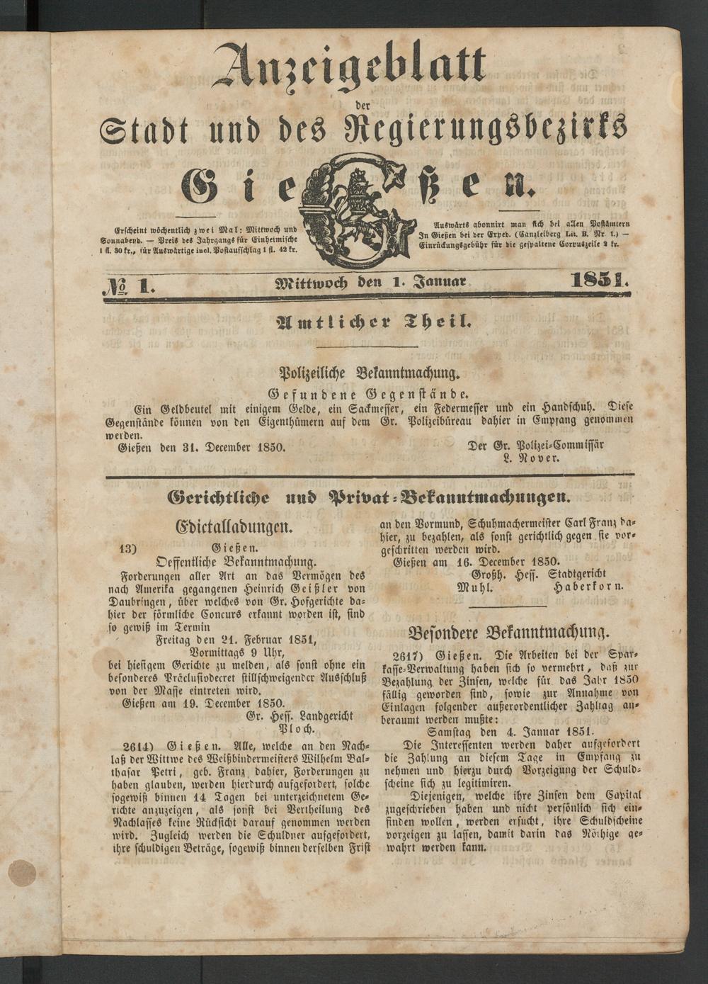 Gießen den 31. December 1850. Der Gr. Polizei-Commissar