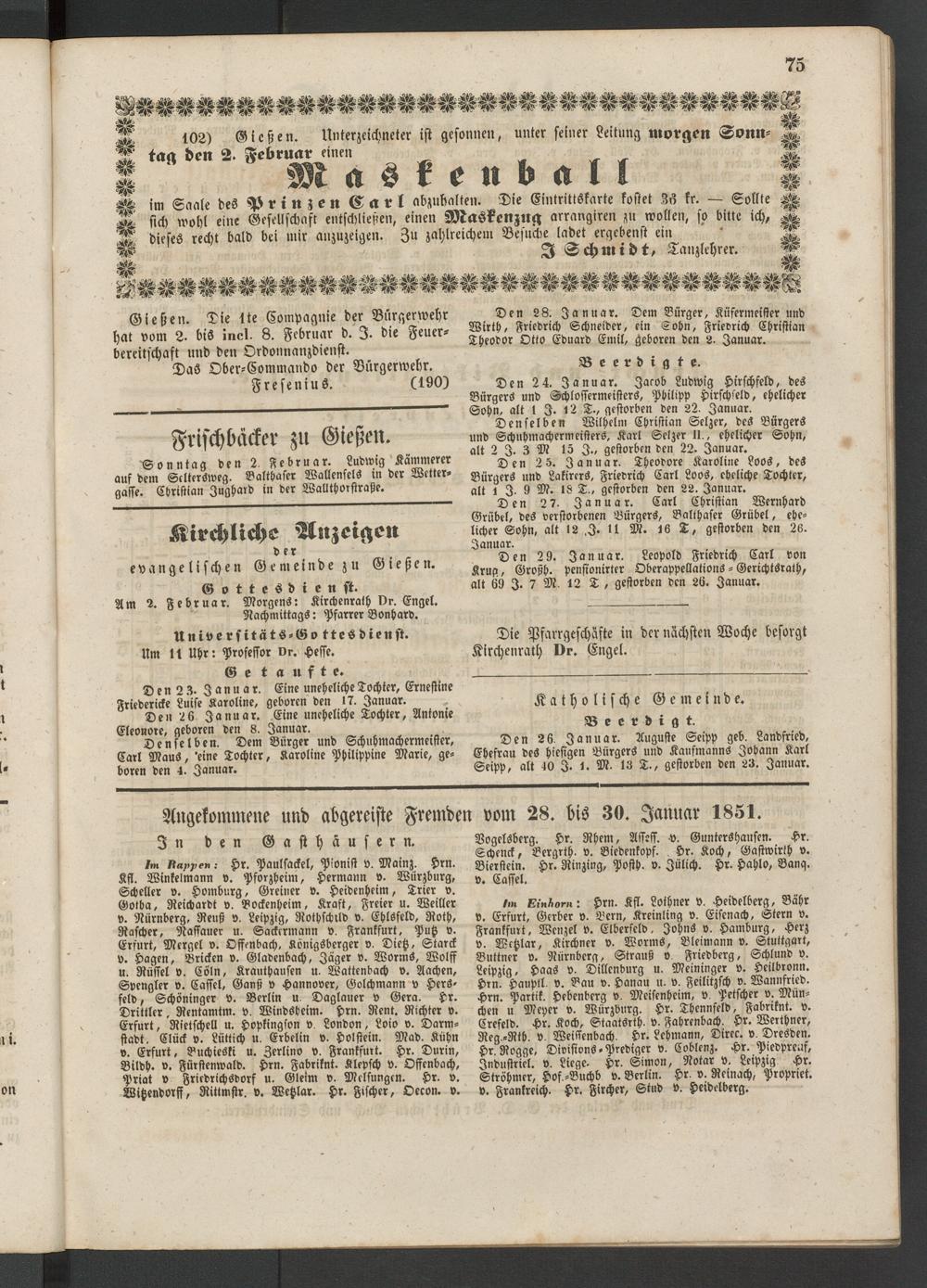 Im Kappen: Hr. Paulsackel, Pionist v. Mainz. Hrn. Kfl. Winkelmann v. Pforzheim, Hermann v. Würzburg, Scheller v. Homburg, Greiner v. Heidenheim, Trier v. Golda, Reichardt v. Pockenheim, Kraft, Freier u. Wciller v. Nürnberg, Reich v. Leipzig, Rothschild v. Ehlsfeld, Roth, Rascher, Nassauer u. Sackcrmann v. Frankfurt, Putz v. Erfurt, Mergel v. Offenbach, Königsberger v. Dietz, Starck v. Hagen, Bricken v. Gladenbach, Jäger v. Worms, Wolff u. Rüffel v. Cöln, Krauthausen u. Wattenbach v. Aachen, Svengler v. Cassel, Gang v Hannover, Golchmann v Hersfeld, Schöninger v. Berlin u. Daglauer v Gera. Hr. Drilller, Rentamt»:, v. Windsheim. Hrn. Rent. Richter v. Erfurt, Rietschell u. Hopkingson v. London, Loio v. Darmstadt. Clück v. Lüttich u. Erbelin v. Holstein. Mad. Kühn v. Erfurt, Buchieski u. Zerlino v. Frankfurt. Hr. Durin, Bildh. v. Fürstenwald. Hrn. Fabriknt. Klepsch v. Offenbach, Priat v Friedrichsdorf u. Gleim v. Melsungen. Hr. v. Witzendorff, Rittmstr. v. Wetzlar. Hr. Fischer, Oecon. v.