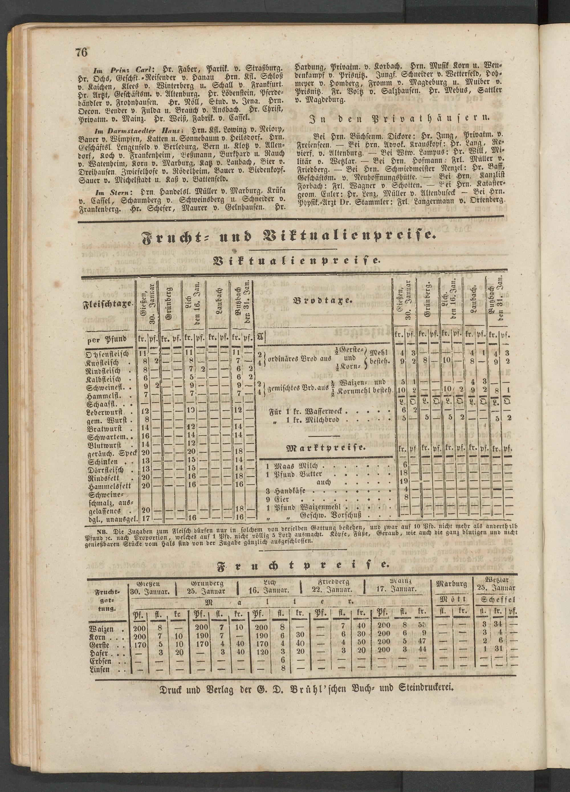 Im Prim Carl: Hr. Faber, Partik. v. Straßburg. Hr. Ochs, Geschft-Reisender v. Hanau Hrn. Kfl. Schloß v. Kaichen, Klees v. Winterberg u. Schall v. Frankfurt. Hr. Artzt, Geschäftsm. v. Altenburg. Hr. Löbenstein, Pferde- bändler v. Frohnhausen. Hr. Röll, Sind. v. Jena. Hrn. Oecon. Bender v. Fulda n. Brauch v. Ansbach. Hr. Christ, Privatm. v. Mainz. Hr. Weiß, Fabrik, v. Cassel.