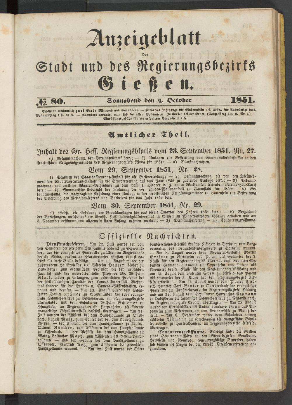 1) Gesetz, die Erhebung der Staatsauflagen für das vierte Quartal des Jahres 1851 betr.; — 2) Verzeichnis der Vorlesungen, welche auf der Großh. Hess. Ludewigs-Universität in Gießen im Winterhalbjahre 1851/52 gehalten und am 3. November bestimmt und allgemein ihren Anfang nehmen werden; — 3) Dienstnachrichten; — -1) Concurrenzeröffnung.