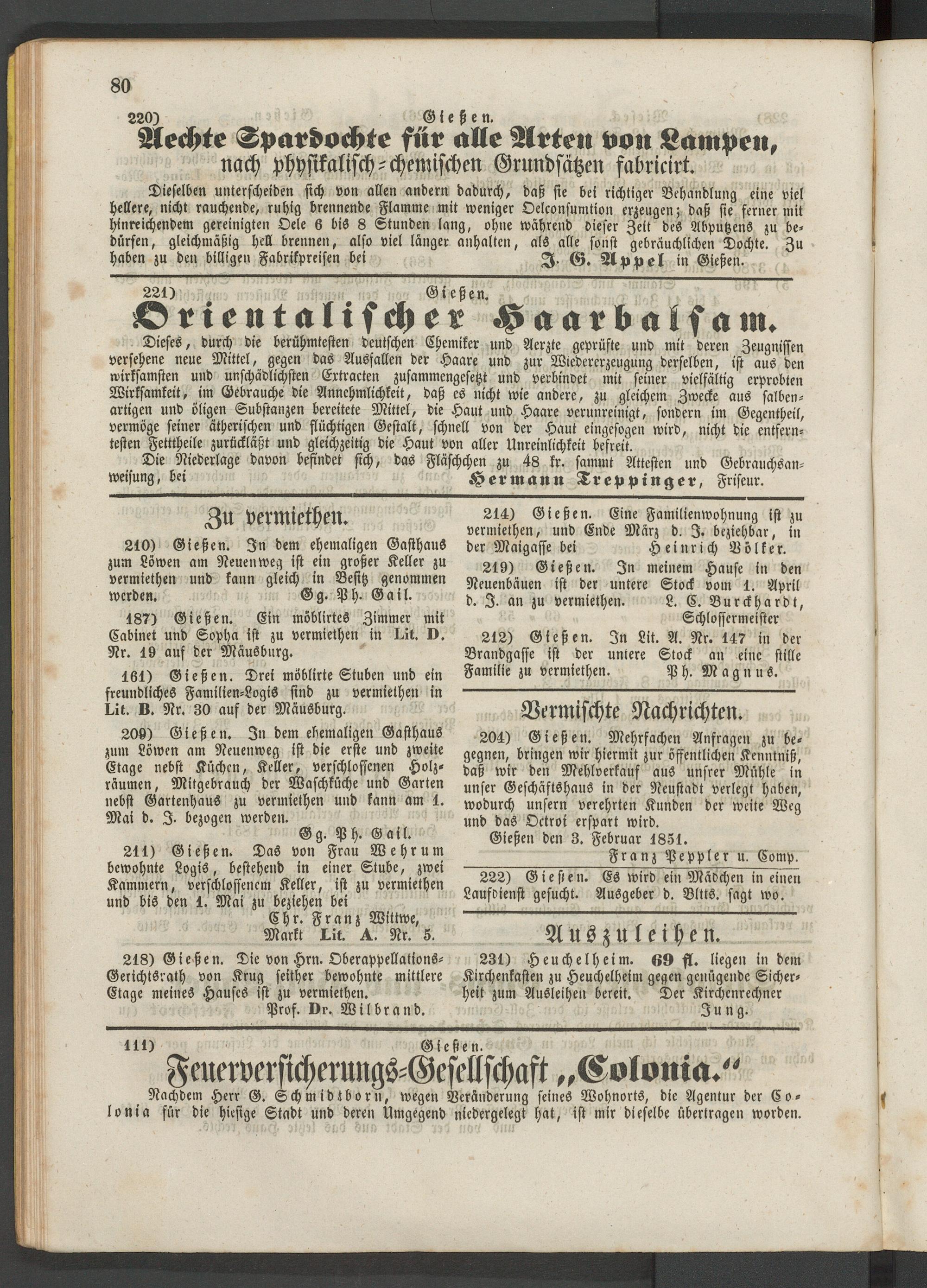 Dieselben unterscheiden sich von allen andern dadurch, daß sie bei richtiger Behandlung eine viel hellere, nicht rauchende, ruhig brennende Flamme mit weniger Oelconsumtion erzeugen; daß sie ferner mit hinreichendem gereinigten Oele 6 bis 8 Stunden lang, ohne während Vieser Zeit des Abputzens zu bedürfen, gleichmäßig hell brennen, also viel länger anhalten, als alle sonst gebräuchlichen Dochte. Zu haben zu den billigen Fabrikpreisen bei I. G. Appel in Gießen.