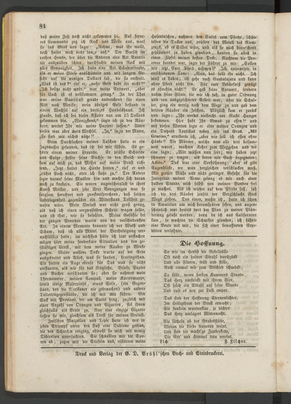 daß meine Zeit noch nicht gekommen sei. Auf ferneres Commando zog ich Rock und Weste ans, warf sie ins Gras und sagte: „Nehmt, was ihr wollt, doch hallet mich nicht lange auf." Der Bursch im rothen Hemde, der über die Anderen eine Art Autorität auszuüben schien, durchsuchte meinen Nock mit aller Genauigkeit. Ich hatte eine Art Schadenfreude, als er meine Börse ausschüttelte und mit langem Gesicht auf die wenigen Dollars sah, die sie enthielt. „Was ist das?" ries er, „mehr Geld habt ihr nicht?" „Ich besitze nicht mehr," war meine Antwort, „aber für Euch ist es vollkommen genug." In der That war meine Baarschaft gerade ausreichend für einen Nitt nach Meriko; mein übriges Geld bestand in einem Wechsel auf ein dortiges Handelshaus. Ich glaube, daß ich bei dieser Affaire nur um 25 Dollars gekommen bin. „Wenigstens," sagte ich zu den Räubern, werdet Ihr mir meine Papiere lassen." Unter diesen war aber mein Wechsel. „Ja," sagte der Mann, „sie sind mir nichts nütze!"
