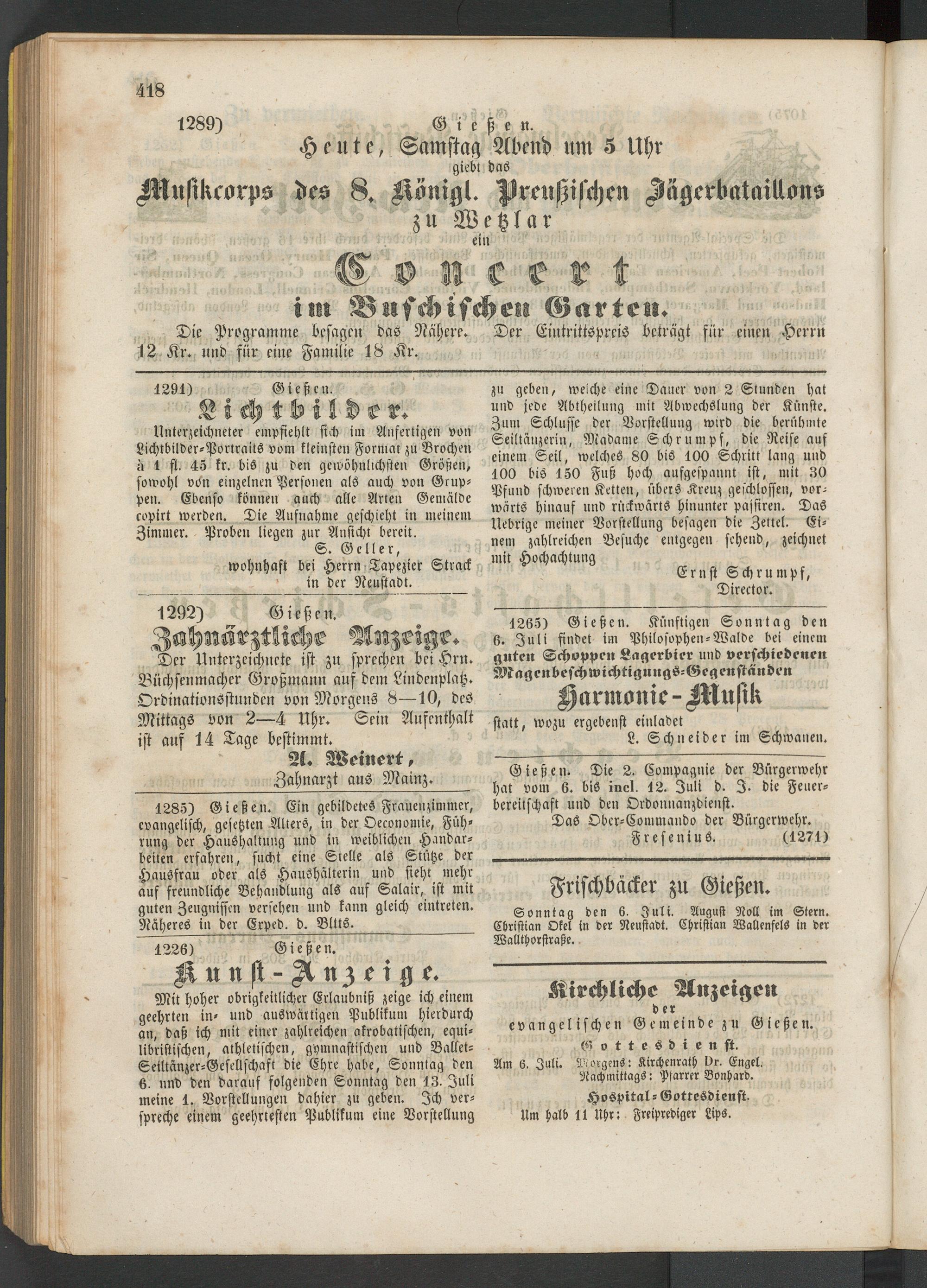 Mit hoher obrigkeitlicher Erlaubniß zeige ich einem geehrten in- und auswärtigen Publikum hierdurch an, daß ich mit einer zahlreichen akrobatischen, equi- libristischen, athletischen, gymnastischen und Ballet- Seiltänzer-Gesellschaft die Ehre habe, Sonntag den 6. und den darauf folgenden Sonntag den 1.3. Juli meine 1. Vorstellungen dahier zu geben. Ich verspreche einem geehrtesten Publikum eine Vorstellung