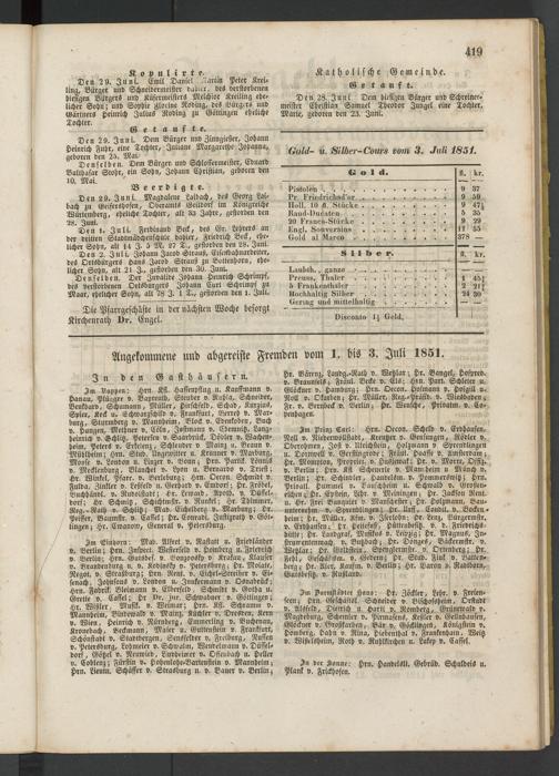 Angekommene und abgereiste Fremden vom 1. bis 3. Juli 1851.