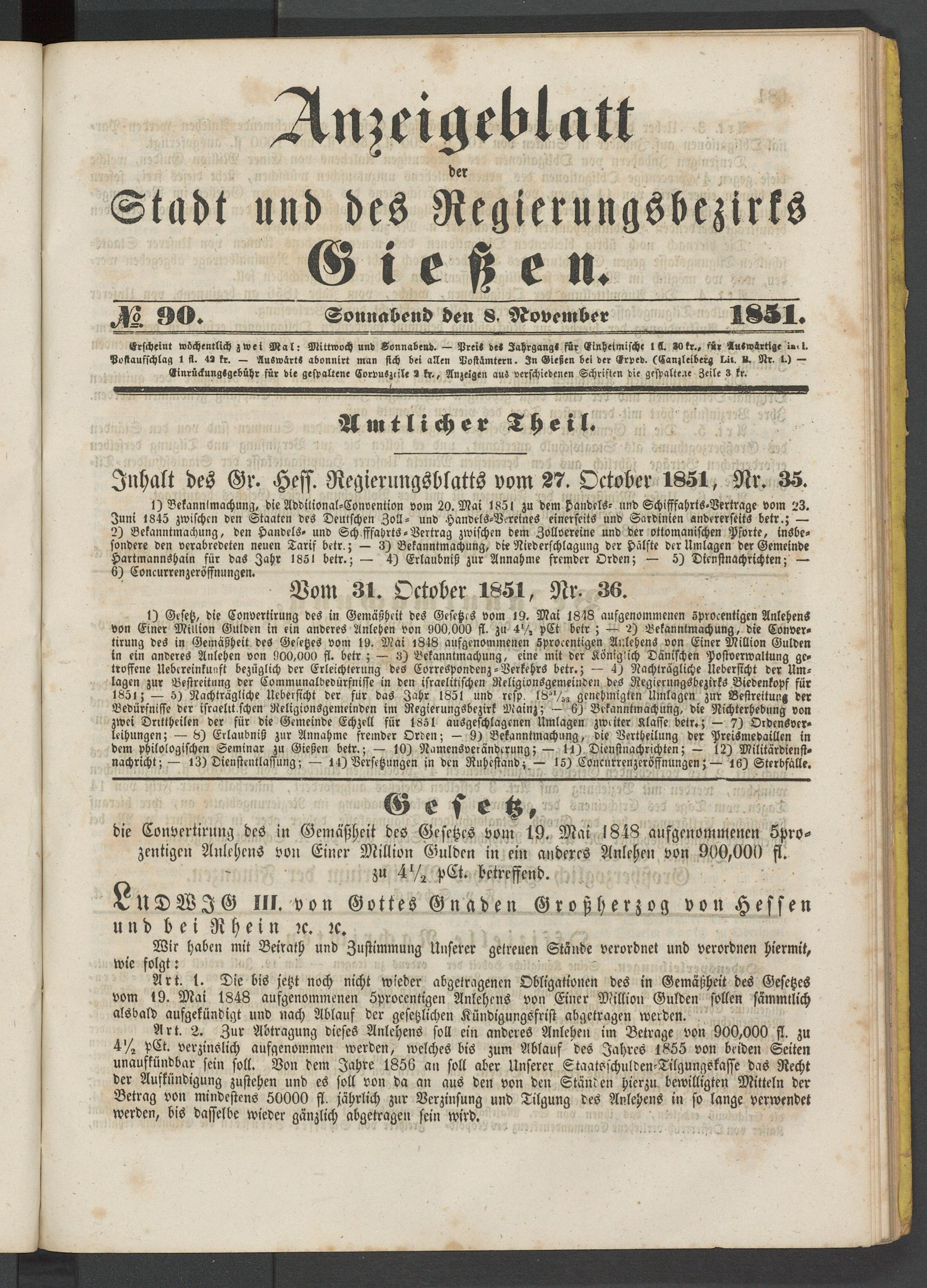 1) Gesetz, die Convcrtirung des in Gemäßheit des Gesetzes vom 19. Mai 1848 ausgenommen«!! öproeentigen Anlehens von Einer Million Gulden in ein anderes Anlehen von 900,000 fl. zu 41/, pCt betr; — 2) Bekanntmachung, die Conver- tirung des in Gemäßheit des Gesetzes vom 19. Mai i848 aufgcnommenen üproccntigen Ai.lehenS von Einer Million Gulden in ein anderes Anlehen von 900,000 fl. betr ; — 3) Bekanntmachung, eine mit der Königlich Dänischen Postverwaltung getroffene Uebereinkunft bezüglich der Erleichterung des Correspondenz-Verkehrs betr.; — 4) Nachträgliche Uebersicht der Umlagen zur Bestreitung der Communaldedürfniffe in den israelitischen Religionsgemeitiden des Regierungsbezirks Biedenkopf für 185i; — 5) Nachträgliche Uebersicht der für das Jahr 1851 und rcsp. 18s7i3 genehmigten Umlagen zur Bestreitung der Bedürfnisse der israellt.schen Religionsgemeinden im Regierungsbezirk Mainz; — 6) Bekanntmachung, die Nichterhebnng von zwei Drittheilen der für die Gemeinde Echzell für 1851 ausgcschlagenen Umlagen zweiter Klasse betr.; — 7) Ordensverleihungen; — 8) Erlaubniß zur Annahme fremder Orden; — 9) Bekanntmachung, vie Bertheilung der PreiSmedaillen in dem philologischen Seminar zu Gießen betr.; — 10) Namensveränderung; — 11) Dienstnachrichten; — 12) Militärdienstnachricht; — 13) Dienstentlassung; — 14) Versetzungen in den Ruhestand; — 15) Concurrenzeröffnungen; — 16) Sterbfälle.