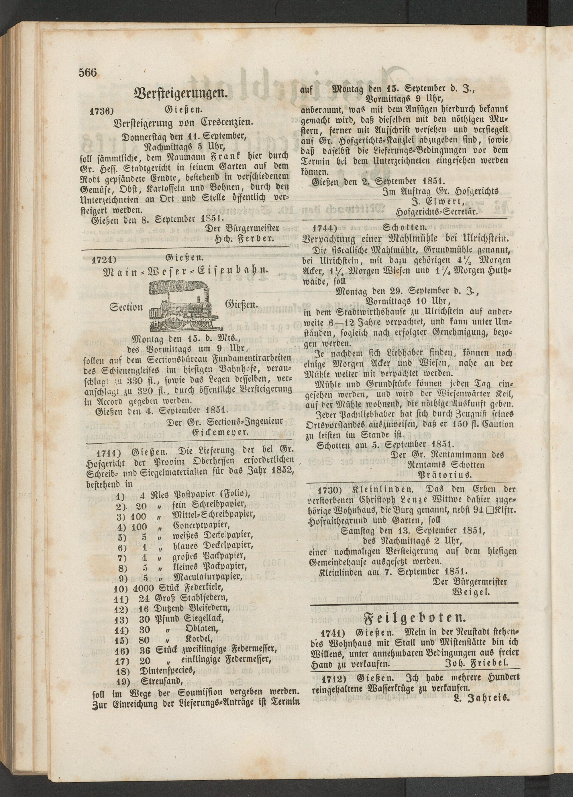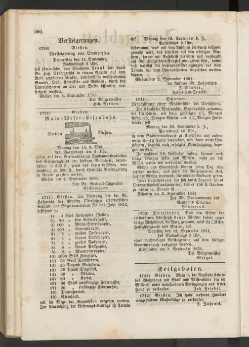 1711) Gießen. Die Lieferung der bei Gr. Hofgericht der Provinz Oberheffen erforderlichen Schreib- und Sicgelmaterialien für das Jahr 1852, bestehend in