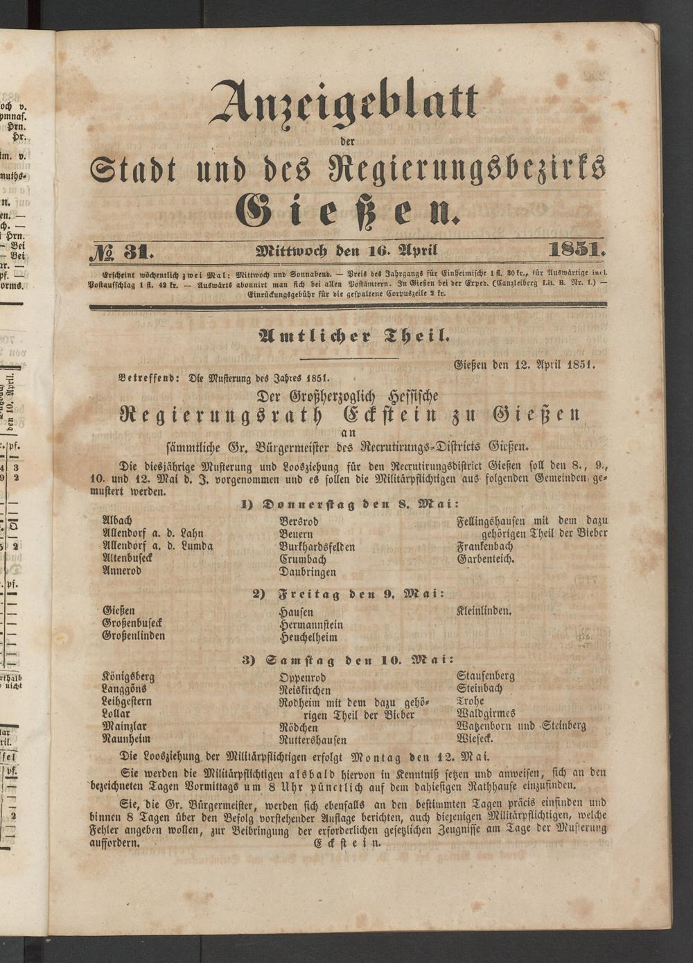 Die diesjährige Musterung und LooSziehung für den Recrutirungsdistrict Gießen soll den 8., 9., 10. und 12. Mai d. I, vorgenommen und eS sollen die Militärpflichtigen aus- folgenden Gemeinden gemustert werden.