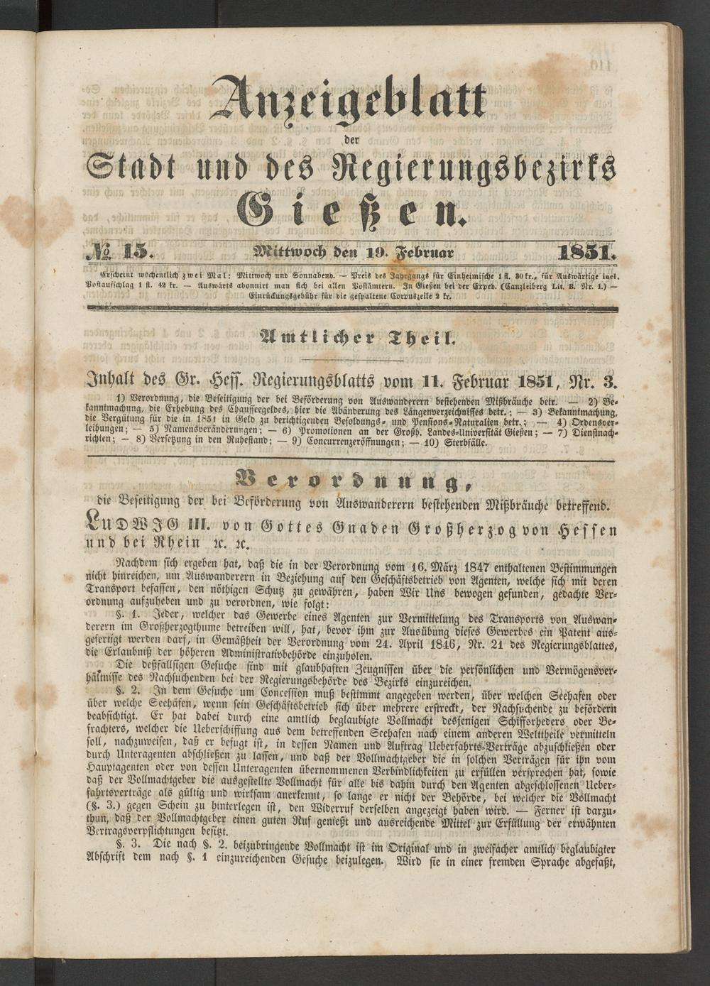 Inhalt des Gr. Hess. Regierungsblatts vom 11. Februar 1851, Nr. 3.
