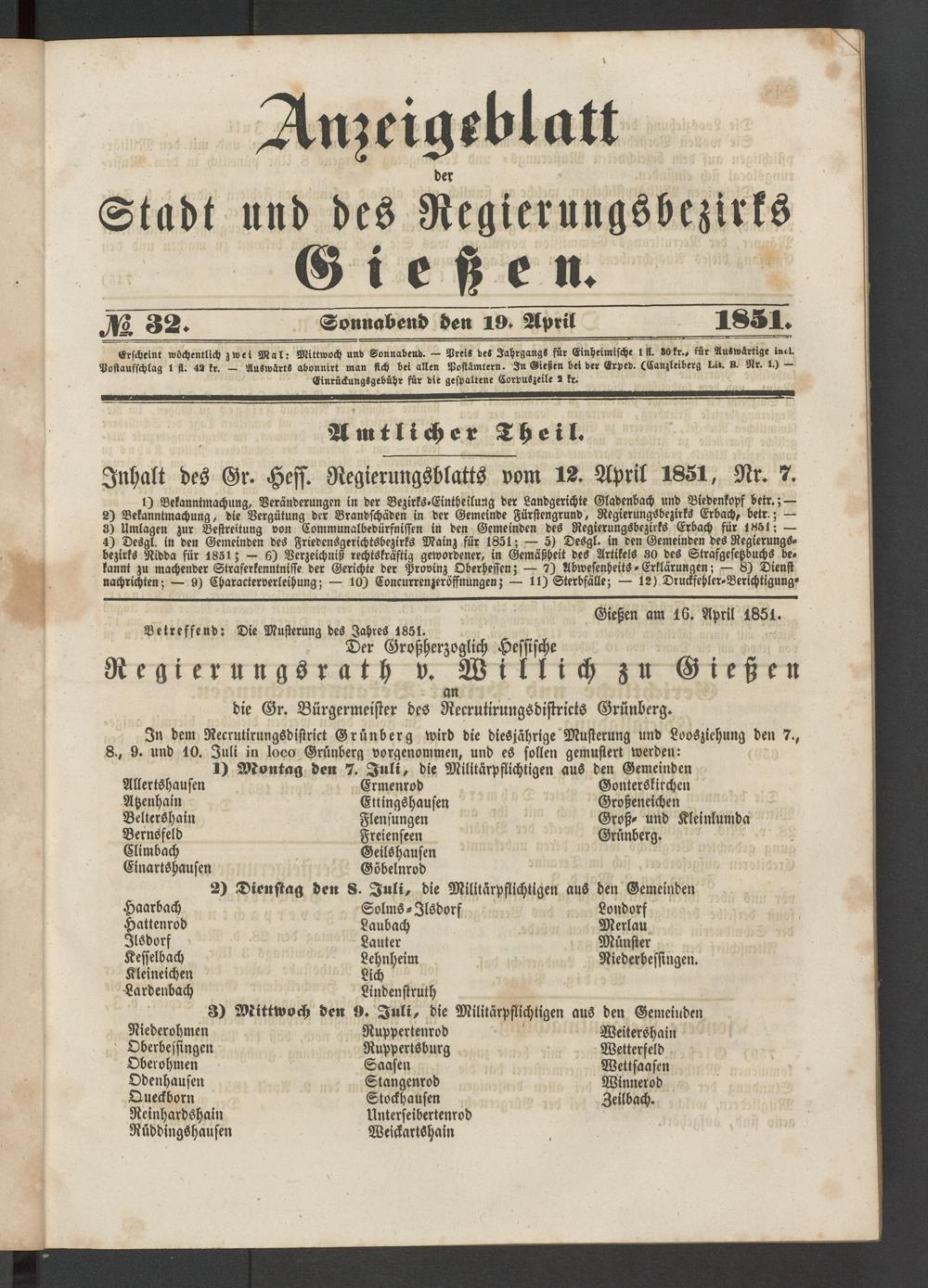 Gießen am 16. April 1851. Betreffend: Die Musterung des Jahres 1851.