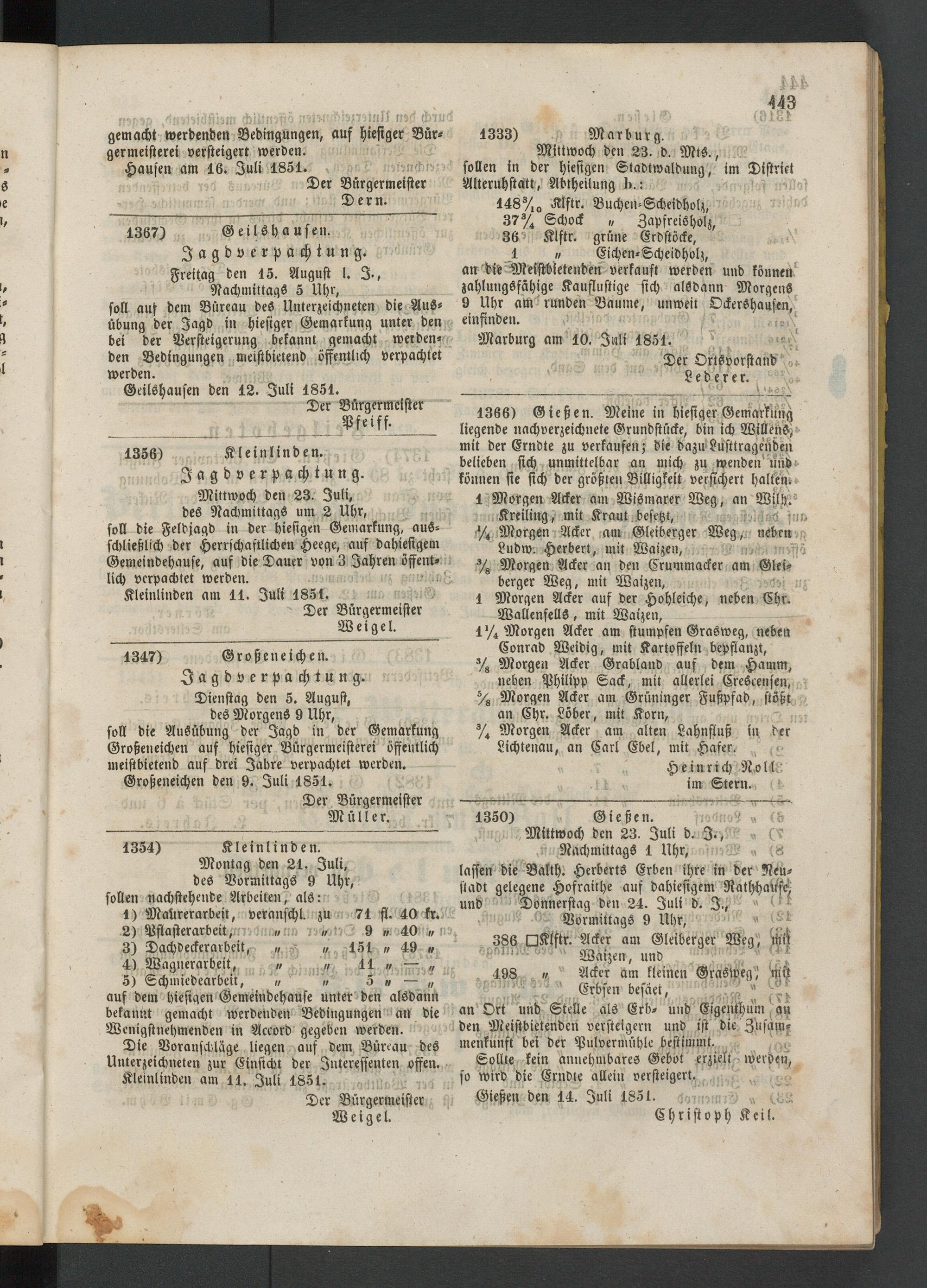 Dienstag den 5. August, des Morgens 9 Uhr, soll die Ausübung der Jagd in der Gemarkung Großen eichen auf hiesiger Bürgermeisterei öffentlich meistbietend auf drei Jahre verpachtet werden. Großeneichcn den 9. Juli 1851.