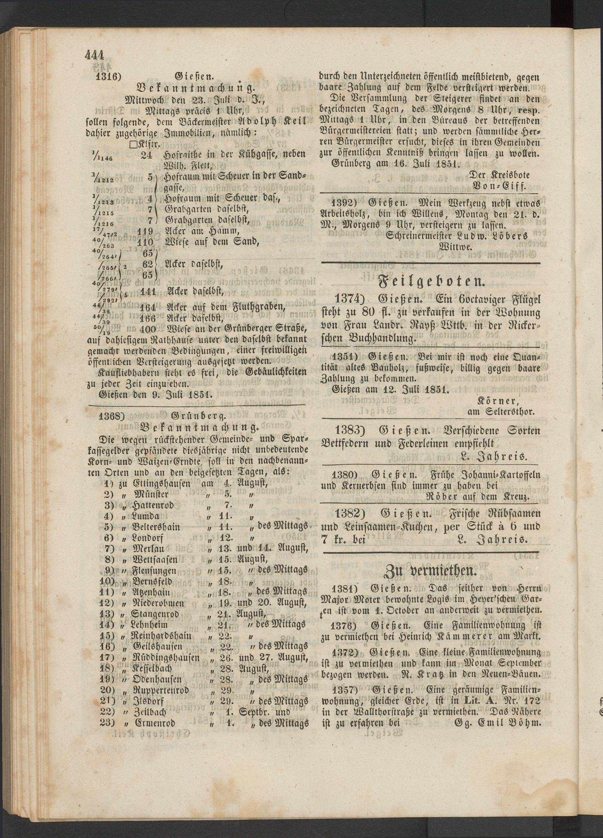 1382) Gießen. Frische Rübsaamen und Leinsaamen-Kuchm, per Stück a b und 7 kr. bei L. Iah reis.
