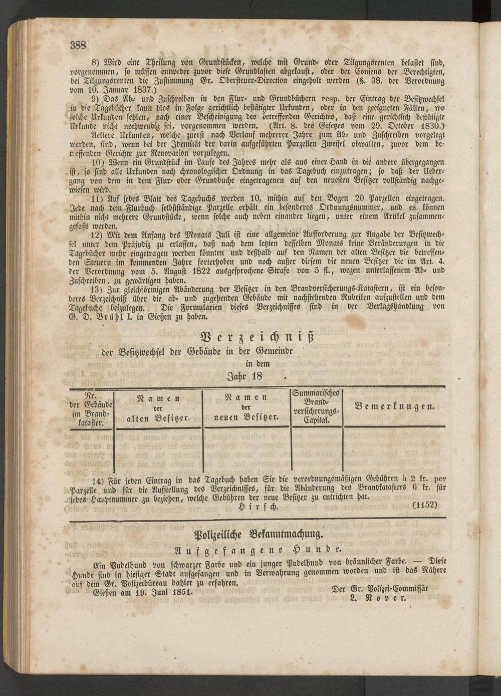 13) Zur gleichförmigen Abänderung der Besitzer in den Brandversicherungs-Katastern, ist ein besonderes Verzeichniß über die ab- und zugehenden Gebäude mit nachstehenden Rubriken aufzustellen und dem Tagebuche beizulegen. Die Formularien dieses Verzeichnisses sind in der Verlagshanblung von G. D. Brühl I. in Gießen zu haben.