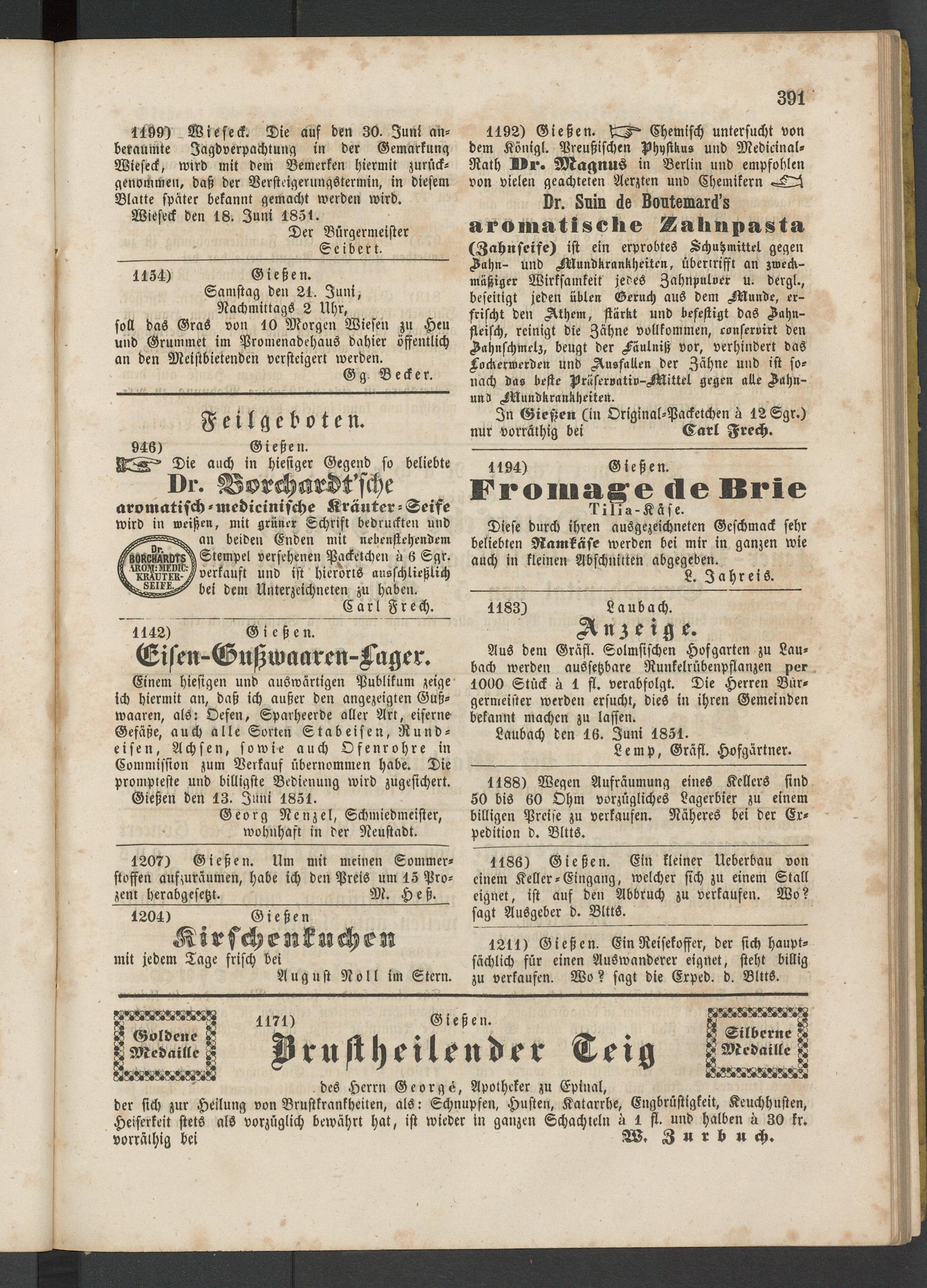 1192) Gießen. Chemisch untersucht von dem Königl. Preußischen Phystkus und Medicinal- Rath Dr. Magnus in Berlin und empfohlen von vielen geachteten Aerzten und Chemikern