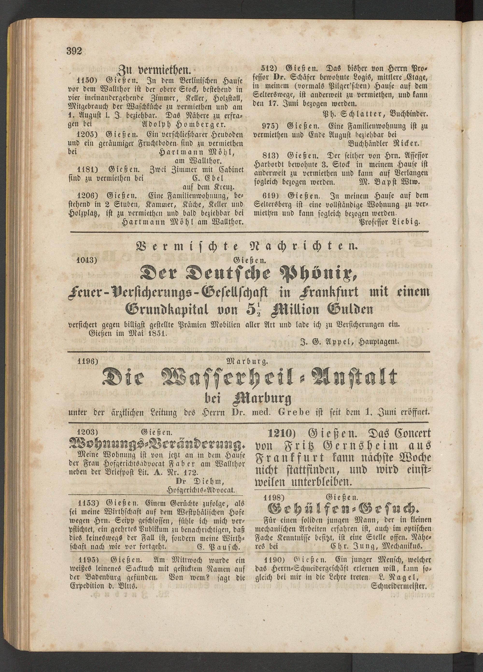 versichert gegen billigst gestellte Prämien Mobilien aller Art und lade ich zu Versicherungen ein. Gießen im Mai 1851.
