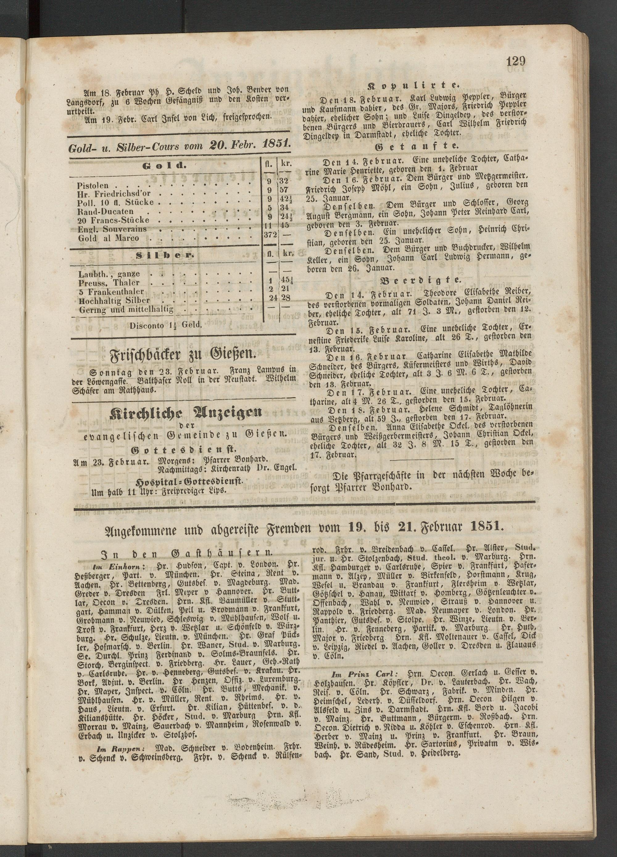 Angekommene und abgereiste Fremden vom 19. bis 21. Februar 1851.