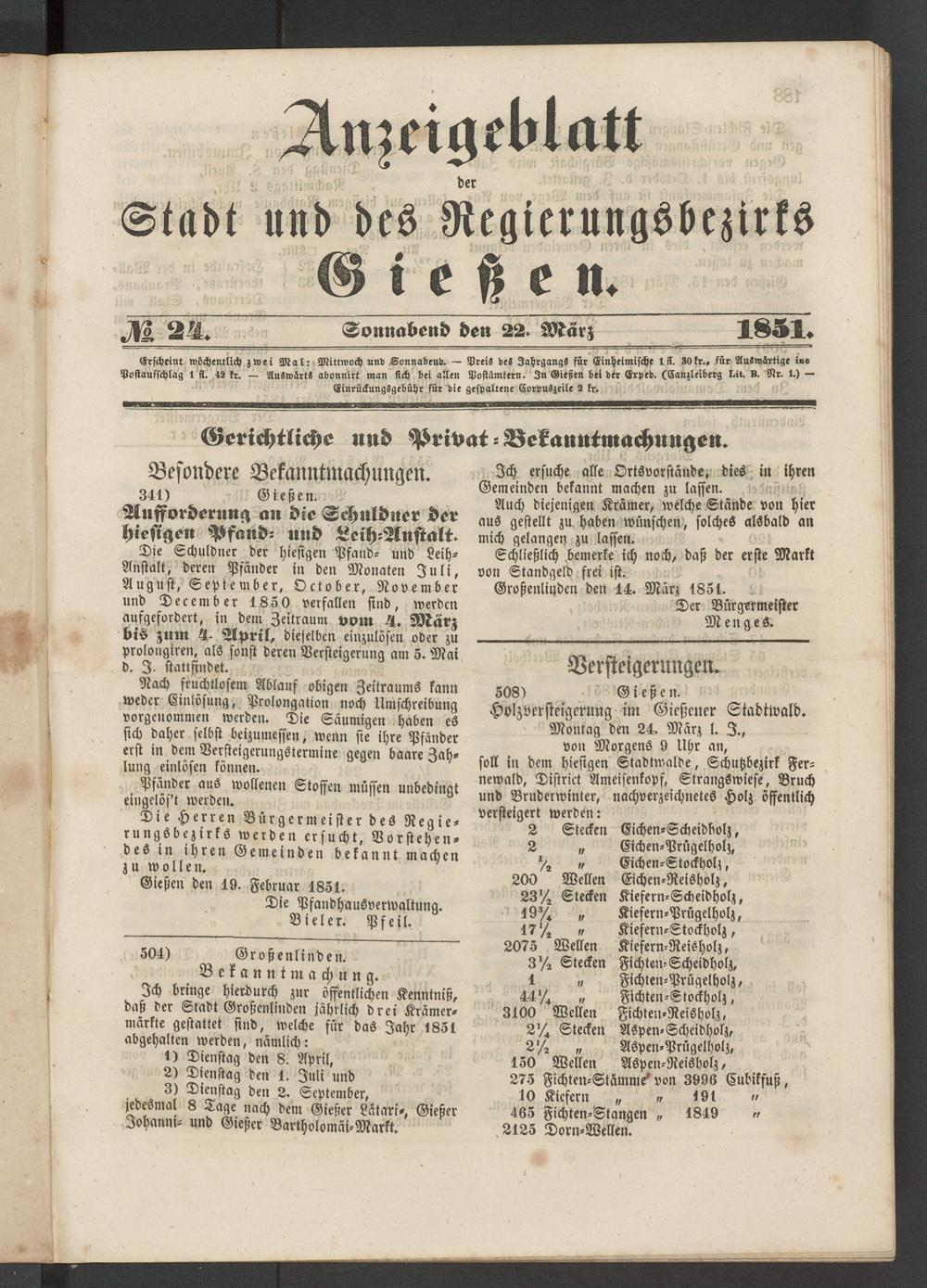 Erscheint wöchentlich zwei Mal: Mittwoch und Sonnabend. — Preis des Jahrgangs für Einheimische 1 ff. 30fr., für Auswärtige ino Postaufschlag 1 st. 42 ft. — Auswärts abonnirt man stch bei allen Postämtern. In Gießen bei der Erpcd. (Canzleiberg Lit. B. Nr. 1.) —