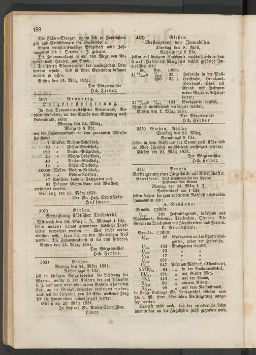555) Gießen. Nächsten Dienstag den 25. März, Vormittags 9 Uhr, sollen in dem Gasthaus zur Sonne zwei Kühe und ein Rind öffentlich meistbietend versteigert werden.