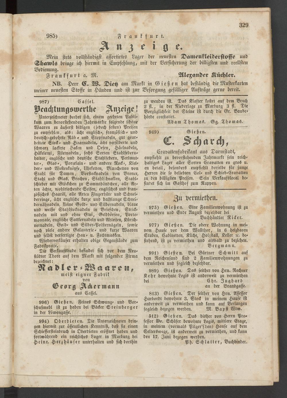 NB. Herr C. W. Dietz am Markt in Gießen hat beständig die Musterkartcn meiner neuesten Stoffe in Händen und ist zur Besorgung gefälliger Aufträge gerne bereit.