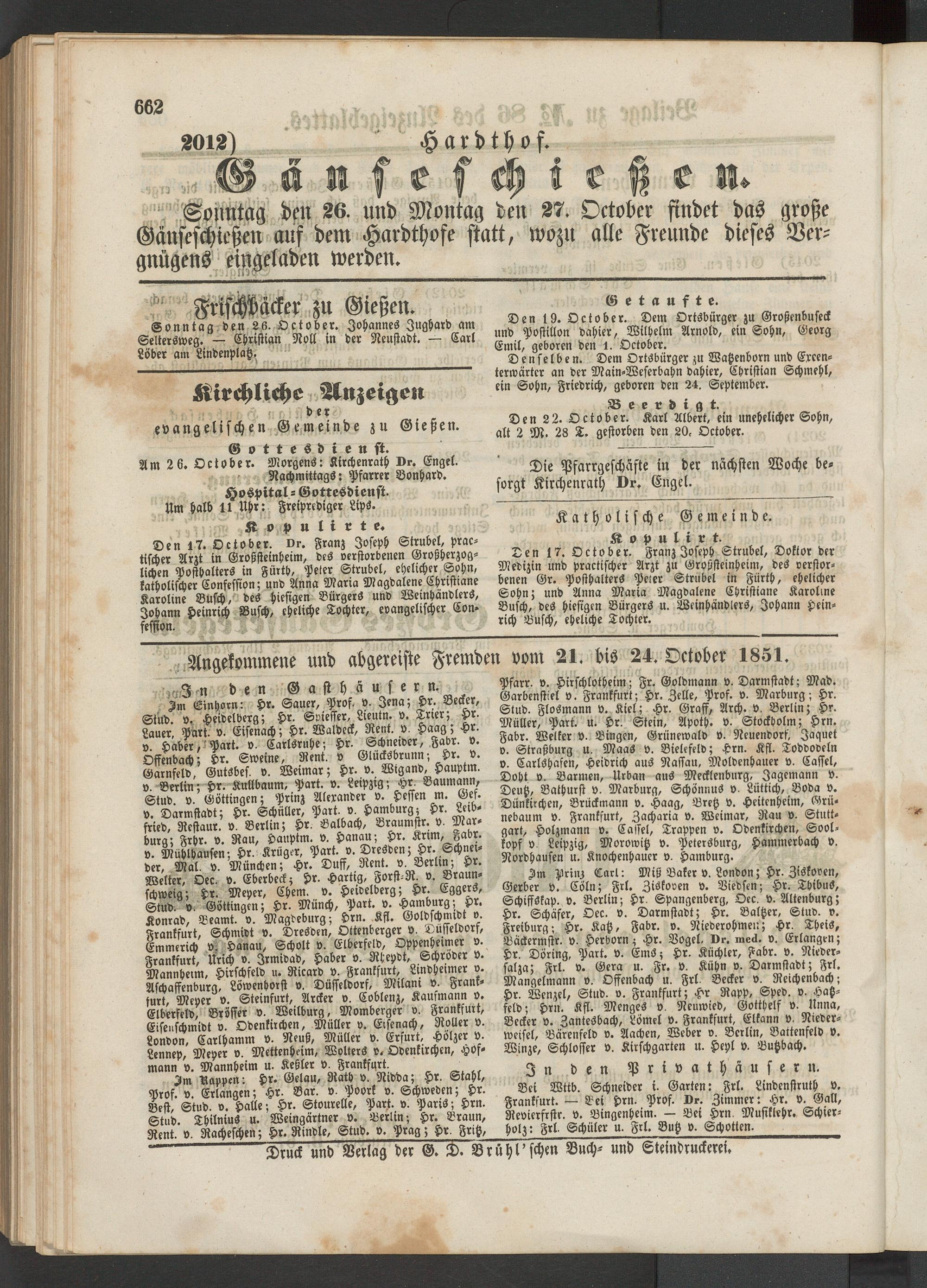 Den 17. October. Dr. Franz Joseph Strubel, prac- tischer Arzt in Großsteinheim, des verstorbenen Großherzoglichen Posthalters in Fürth, Peter Strubel, ehelicher Sohn, katholischer Confessio»; und Anna Maria Magdalene Chrlstiane Karoline Busch, des hiesigen Bürgers und Weinhändlers, Johann Heinrich Busch, eheliche Tochter, evangelischer Con- fesston.