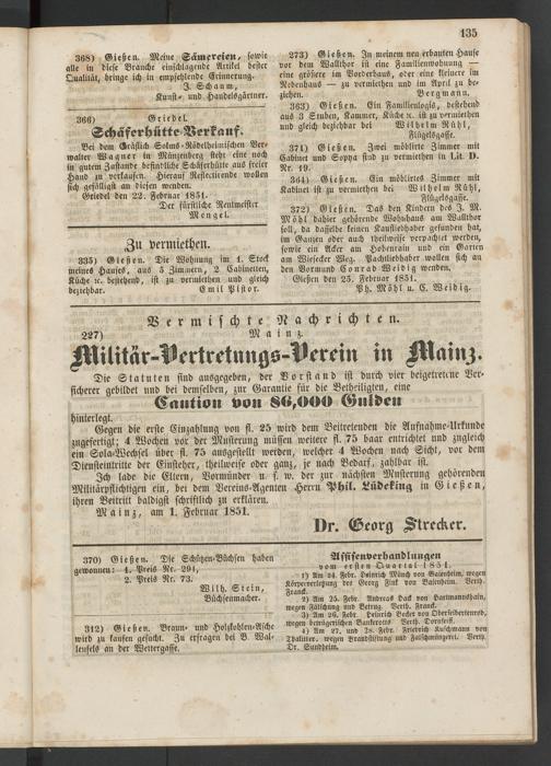 372) Gießen. Das den Kindern des I. M. Möhl dahier gehörende Wohnhaus am Wallthor soll, da dasselbe keinen Kaufliebhaber gefunden hat, im Ganzen oder auch theilweise verpachtet werden, sowie ein Acker am Hobcnrain und ein Garten am Wiesecker Weg. Pachkliebhaber wollen sick) an den Vormund Conrad Weidig wenden.