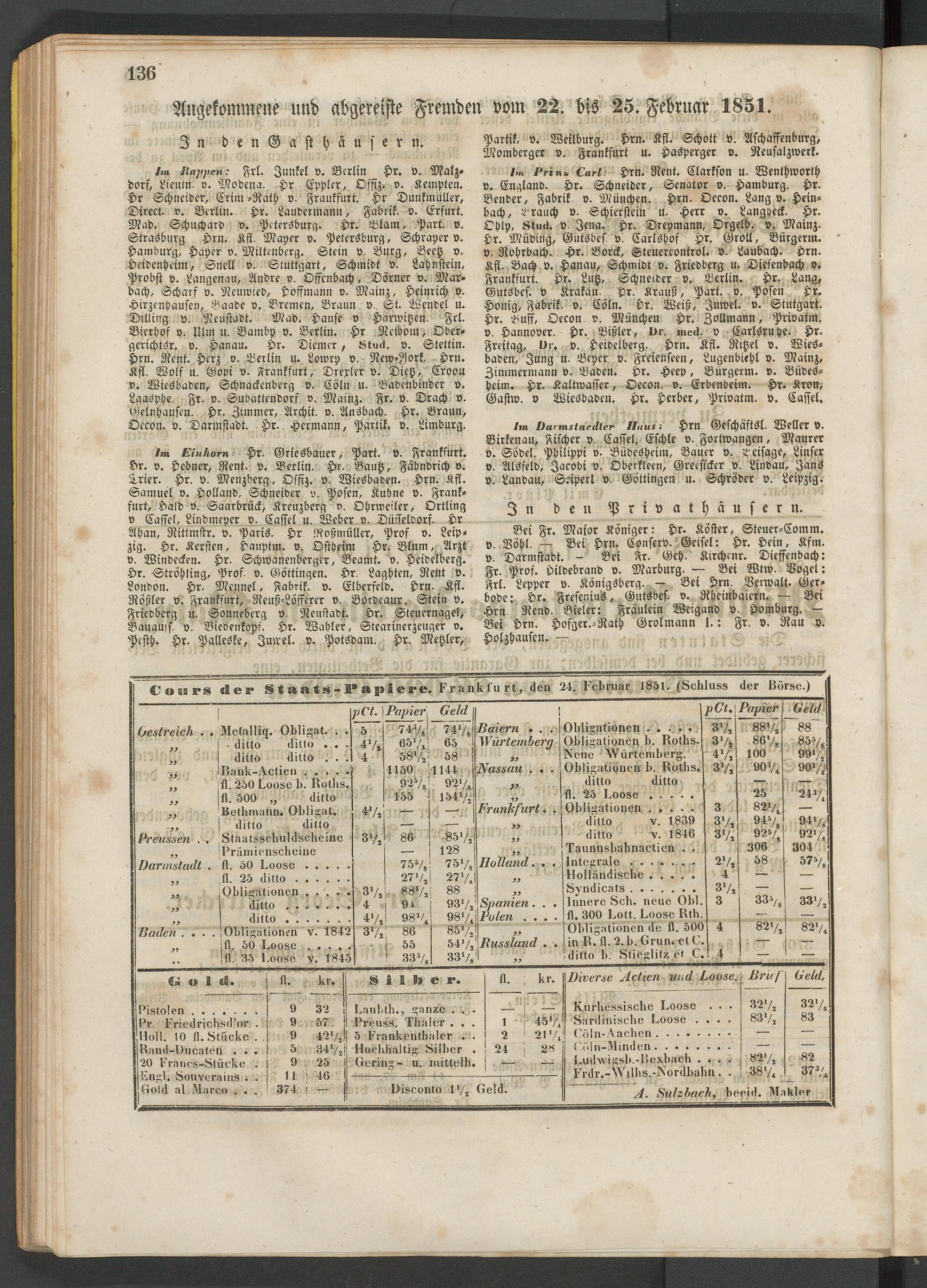 Attgekommene und abgereiste Fremden vom 22. bis 25. Februar 1851.