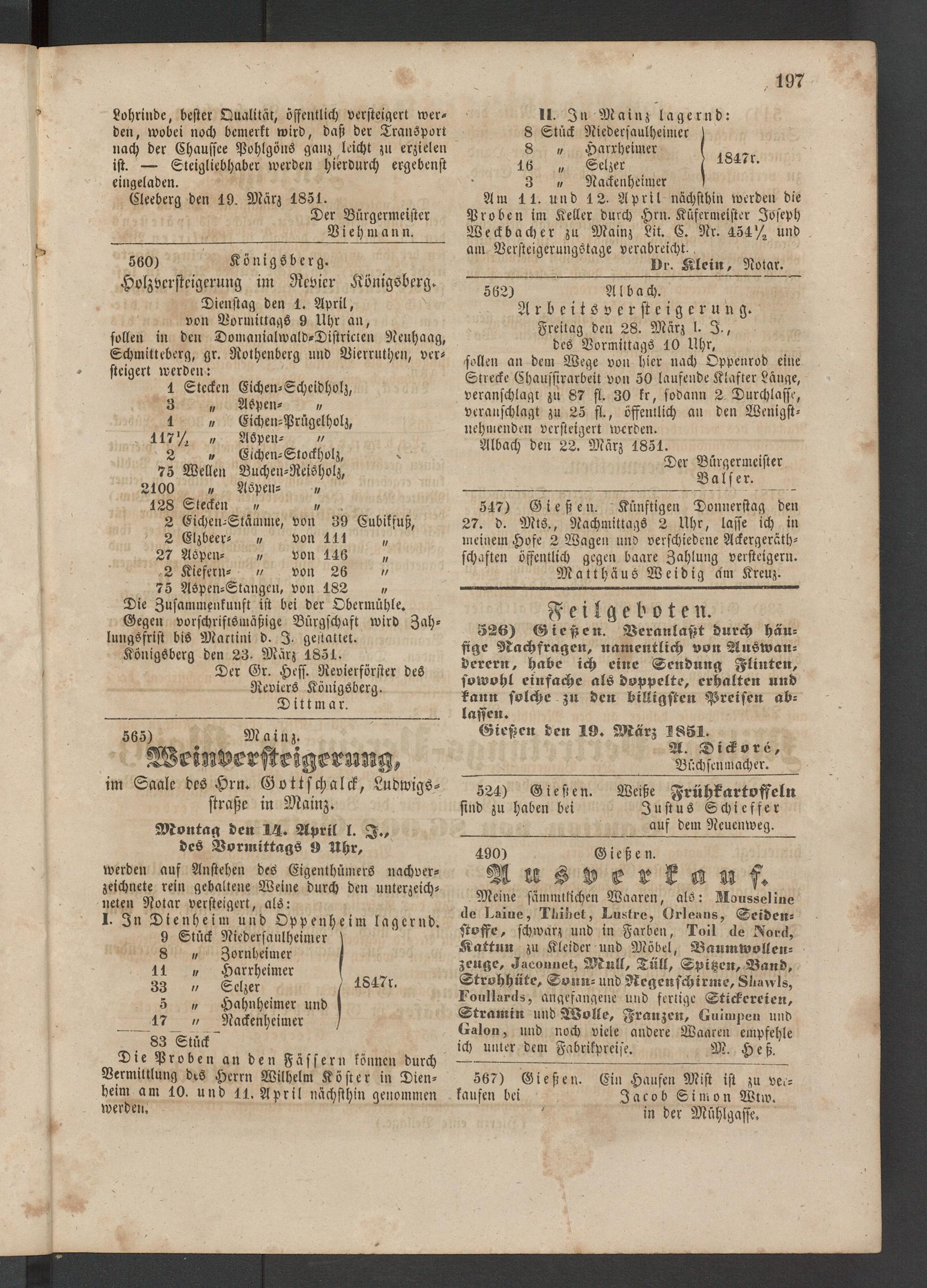 Die Proben an den Fässern können durch Vermittlung des Herrn Wilhelm K ö ft e r in Dienheim am 10. und 11, April nächsthin genommen werden.