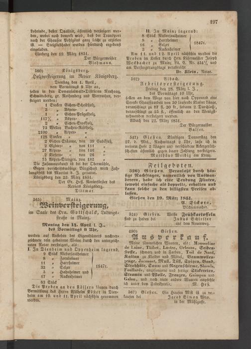 Am 11. und 12- April nächsthin werden die Proben im Keller durch Hrn. Küfermeister Jofeph Weckbach er zu Mainz Lit. C. Nr. 454'/, und am Verftcigcrungötage verabreicht.