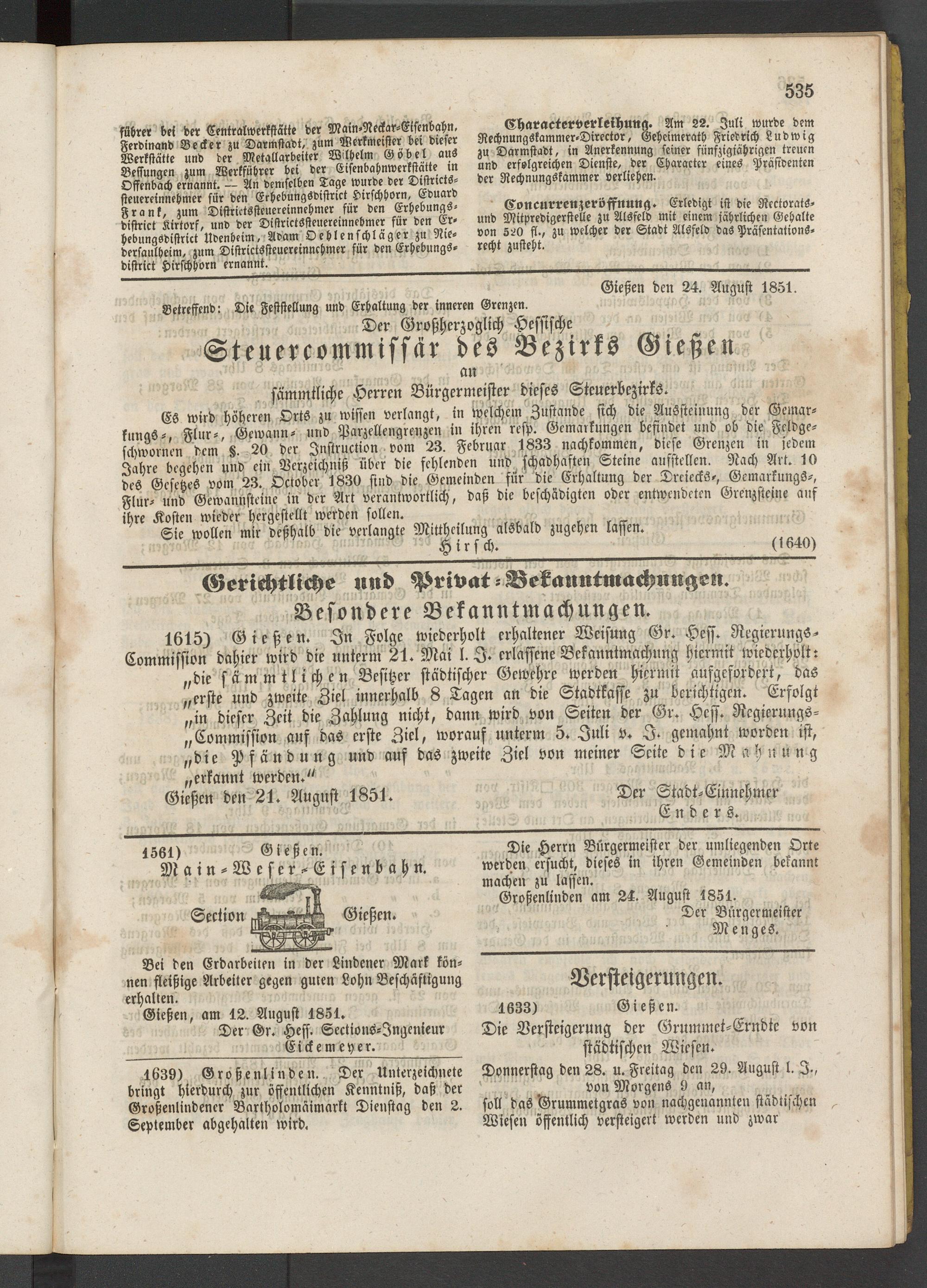 1615) Gießen. Zn Folge wiederholt erhaltener Weisung Gr. Heff. Regierungs- Commission dahier wird die unterm 21. Mai l. I. erlassene Bekanntmachung hiermit wiederholt: