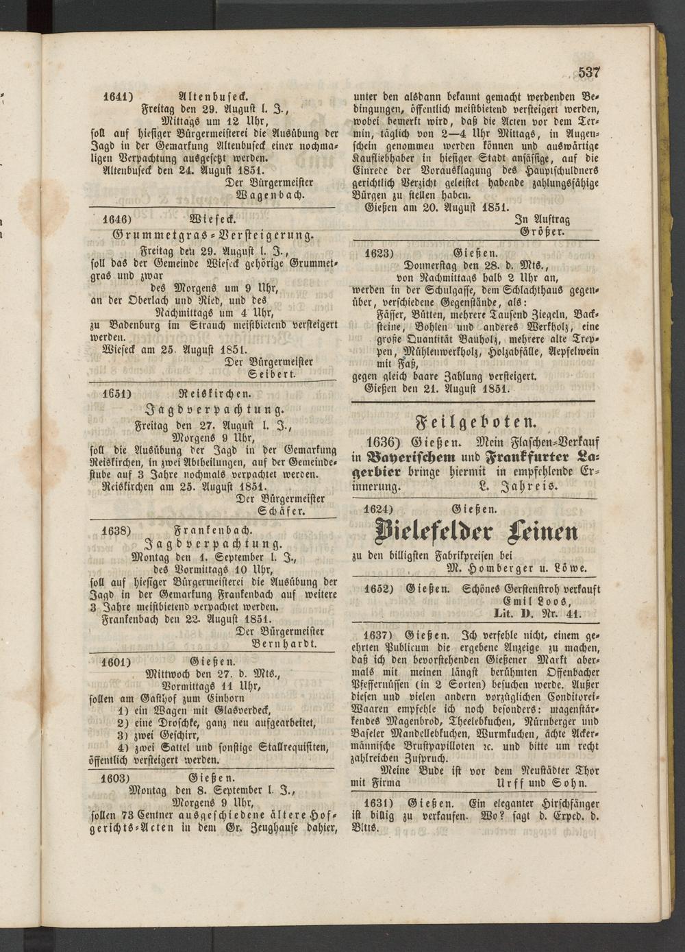 1631) Gießen. Ein eleganter Hirschfänger ist billig zu verkaufen. Wo? sagt d. Erped. d. BittS.