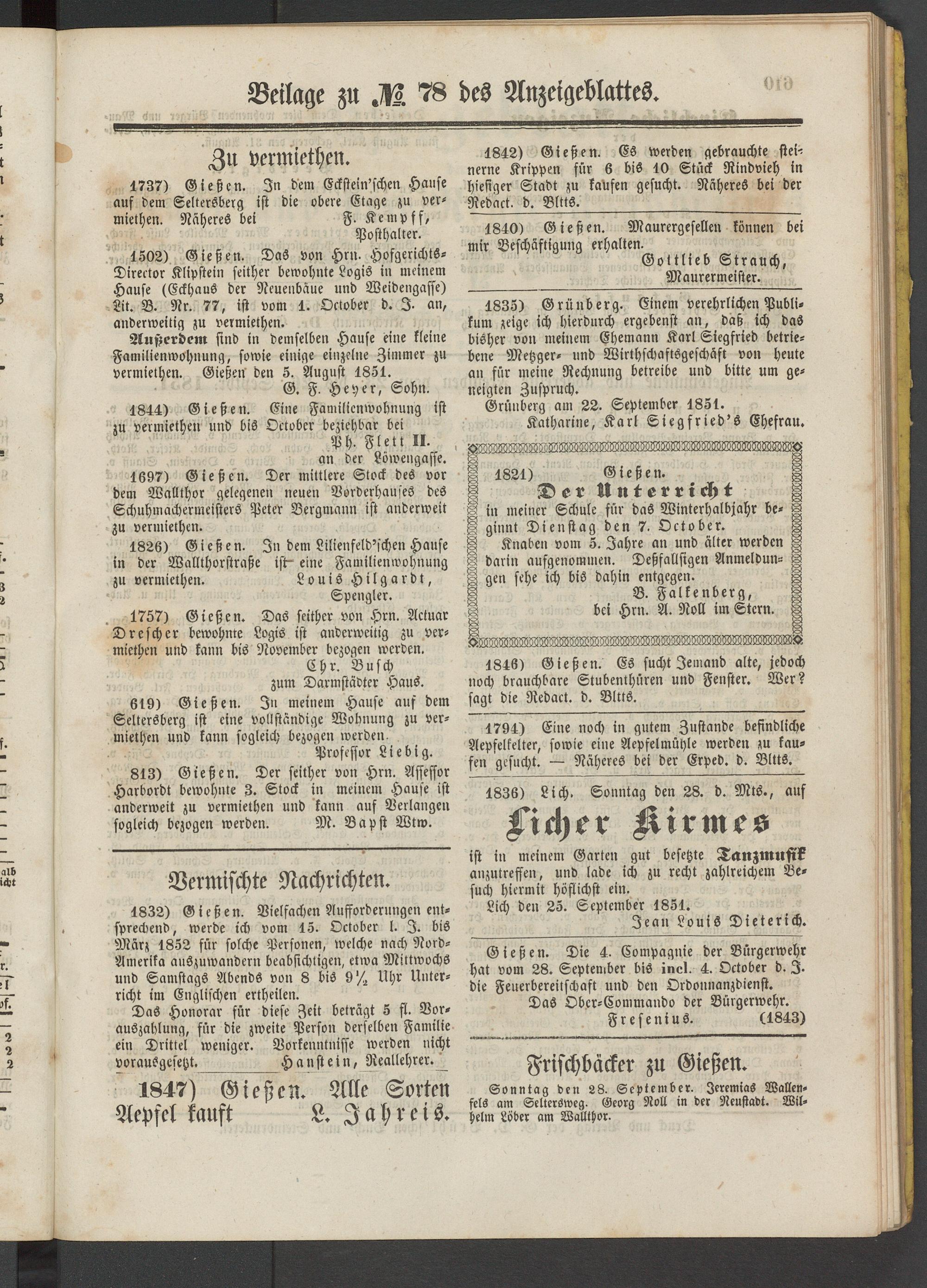 1502) Gießen. Das von Hrn. Hofgerichts- Direetor Klipstein seither bewohnte Logis in meinem Hause (Eckhaus der Neuenbäue und Weidengasse) Lil. B. Nr. 77, ist vom 1. October d. I. an, anderweitig zu vermiethen.