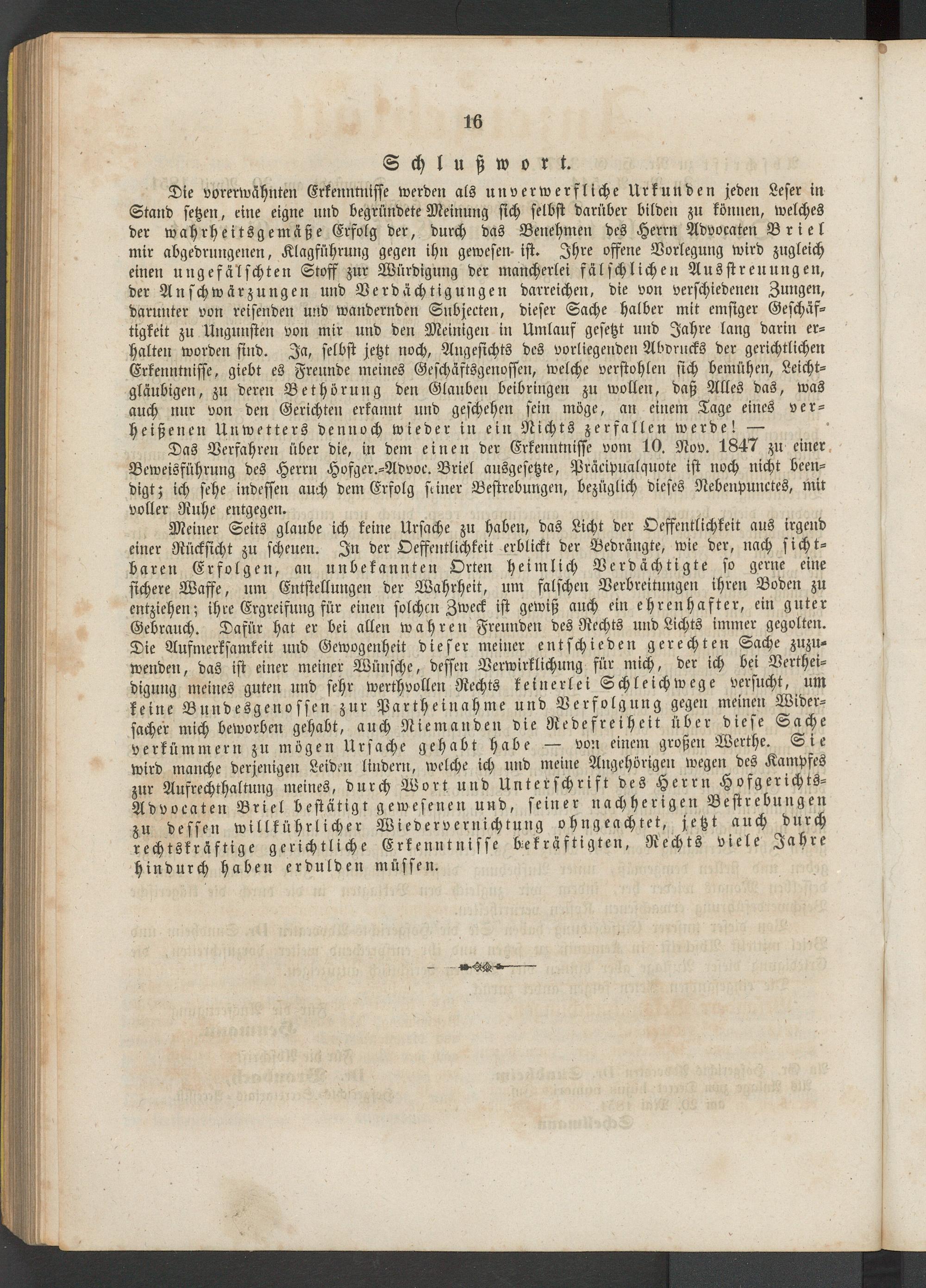Die vorerwähnten Erkenntnisse werden als unverwerfliche Urkunden jeden Leser in Stand setzen, eine eigne und begründete Meinung sich selbst darüber bilden zu können, welches der wahrheitsgemäße Erfolg der, durch das Benehmen des Herrn Advocaten Briel mir abgedrungenen, Klagführung gegen ihn gewesen- ist. Ihre offene Vorlegung wird zugleich einen ungefälschten Stoff zur Würdigung der mancherlei fälschlichen Ausstreuungen, der Anschwärzungen und Verdächtigungen darreichen, die von verschiedenen Zungen, darunter von reisenden und wandernden Subjecten, dieser Sache halber mit emsiger Geschäftigkeit zu Ungunsten von mir und den Meinigen in Umlauf gesetzt und Jahre lang darin erhalten worden sind. Ja, selbst jetzt noch, Angesichts des vorliegenden Abdrucks der gerichtlichen Erkenntnisse, giebt es Freunde meines Geschäftsgenossen, welche verstohlen sich bemühen, Leichtgläubigen, zu deren Bethörung den Glauben beibringen zu wollen, daß Alles das, was auch nur von den Gerichten erkannt und geschehen sein möge, an einem Tage eines verheißenen Unwetters dennoch wieder in ein Nichts zerfallen werde! —
