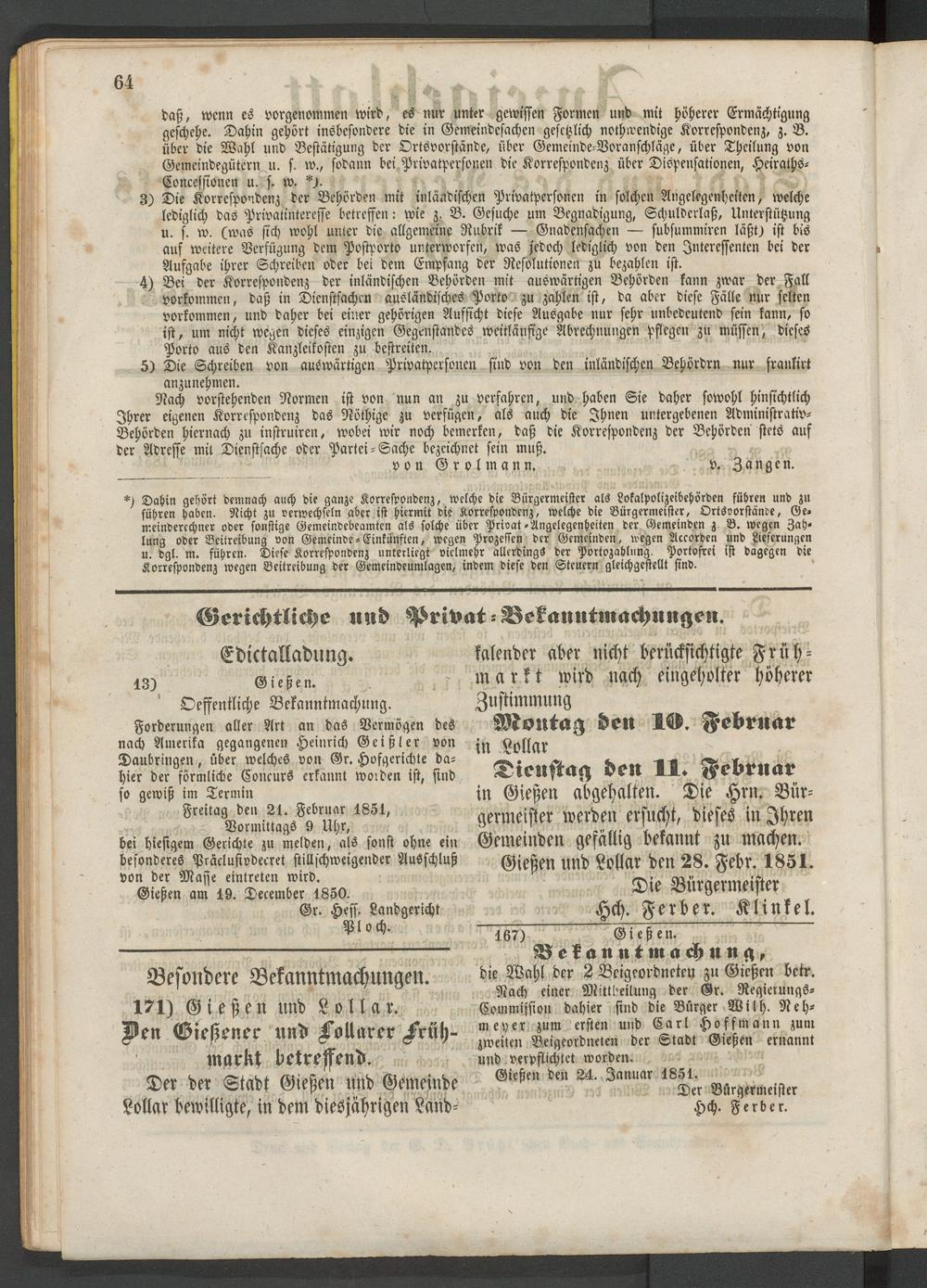 Dienstag den 13L Februar in Gießen abgehalten. Die Hrn. Bürgermeister werden ersucht, dieses in Ihren Gemeinden gefällig bekannt zu machen.