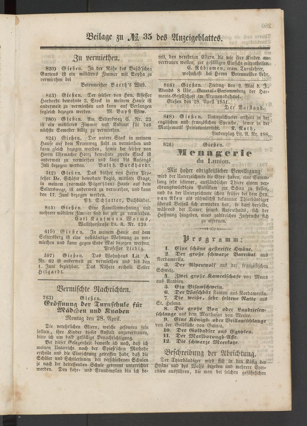 Mit hoher obrigkeitlicher Bewilligung wird der Unterzeichnete die Ehre haben, eine Sammlung sehr seltener, ausländischer Thiere einem verehrungswürdigen Publikum zur Schau zu stellen, und da der Unterzeichnete schon früher bei dem Hrn. van Aken als rühmlichst bekannter Thierbändiger überall Beifall sich erworben hat, so darf derselbe, während der Dauer seines Aufenthalts, sich der Hoffnung hingeben, eines zahlreichen Zuspruchs sich zu erfreuen.