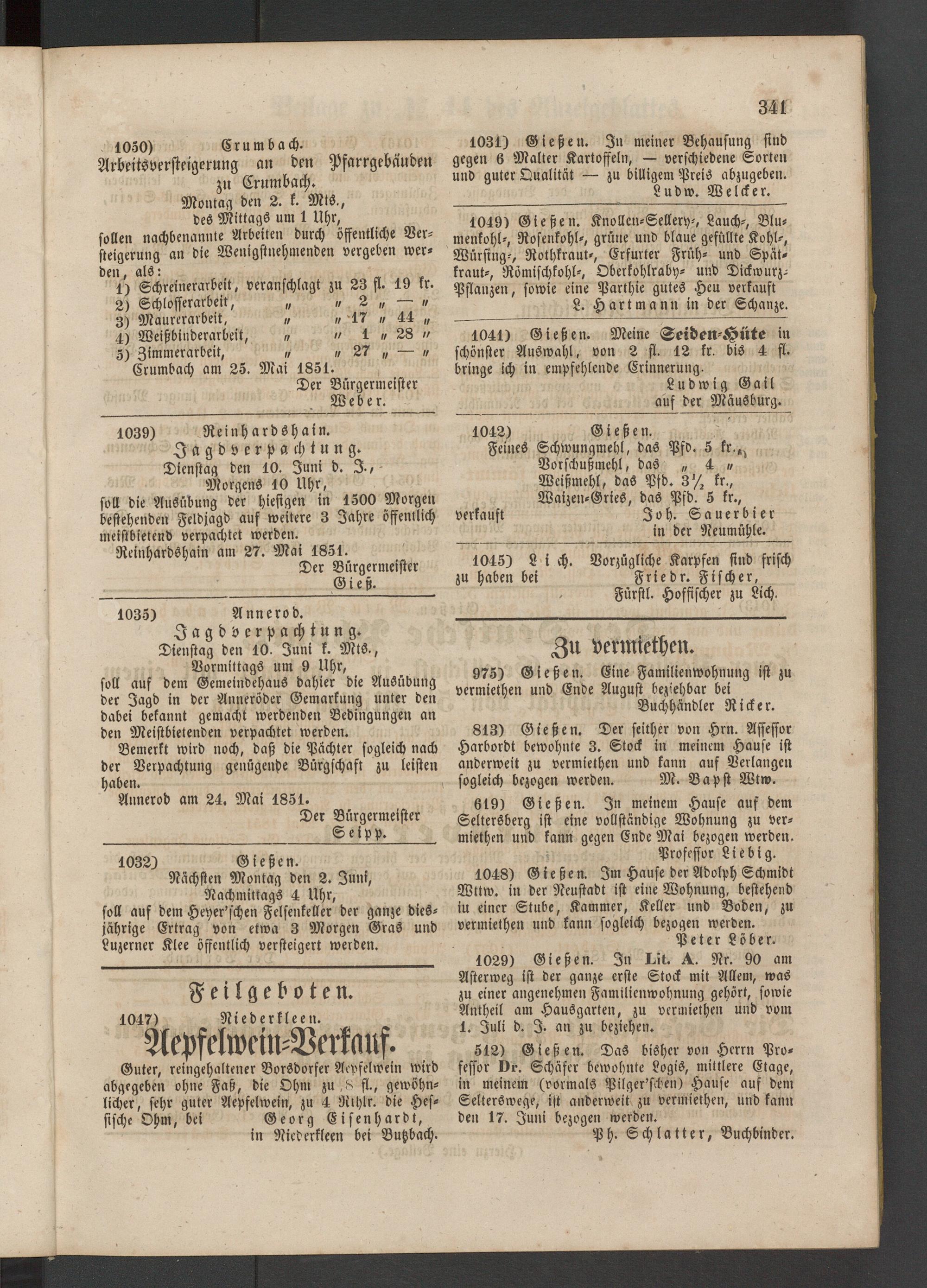 Guter, reingehaltener Borsdorfer Acpfelwein wird abgegeben ohne Faß, die Ohm zu, 8 fl., gewöhnlicher, sehr guter Aepfelwein, zu 4 Rihlr. die Hessische Ohm, bei Georg Eisenhardt, in Niederkleen bei Butzbach.