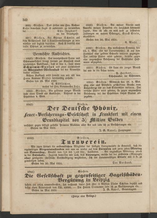 Gießen im Mai 1851. -ä- G. Appel, Generalagent.