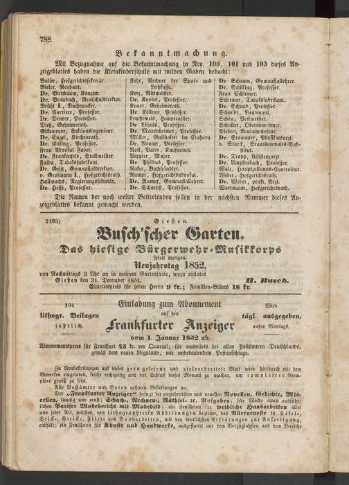 Abonnementspreis für Frankfurt 45 fr. per Quartal; für auswärts bei allen Postämtern Deutschlands, gemäß dem neuen Regulativ, mit unbedeutendem Postaufschlage.