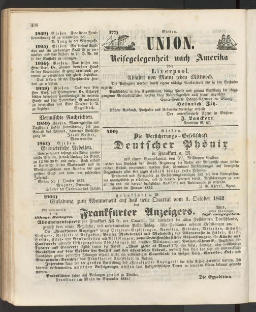 Gießen im Februar 1852. J- G. Appel, Agent.