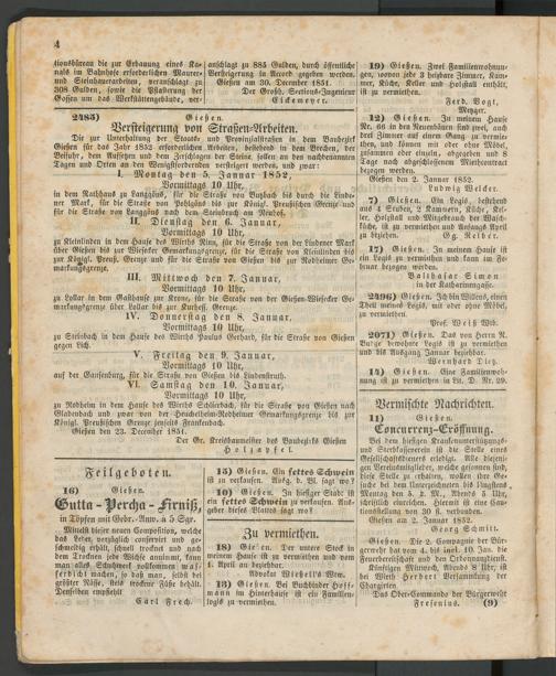 anschlagt zu 885 Gulden, durch öffentliche Versteigerung in Accord gegeben werden. Gießen am 30. December 1851.