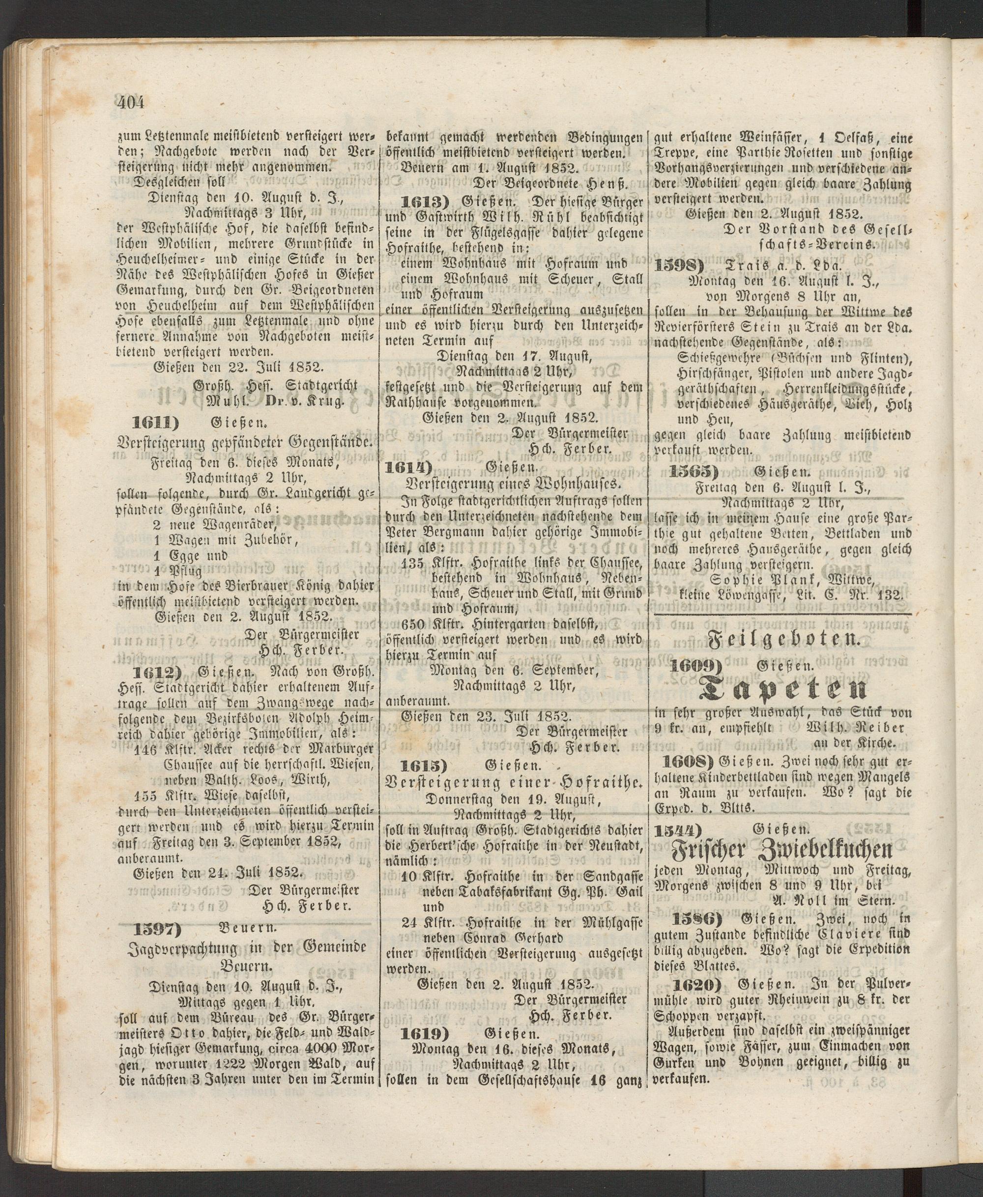 Gießen den 2. August 1852. Der Bürgermeister Hch. Ferber.