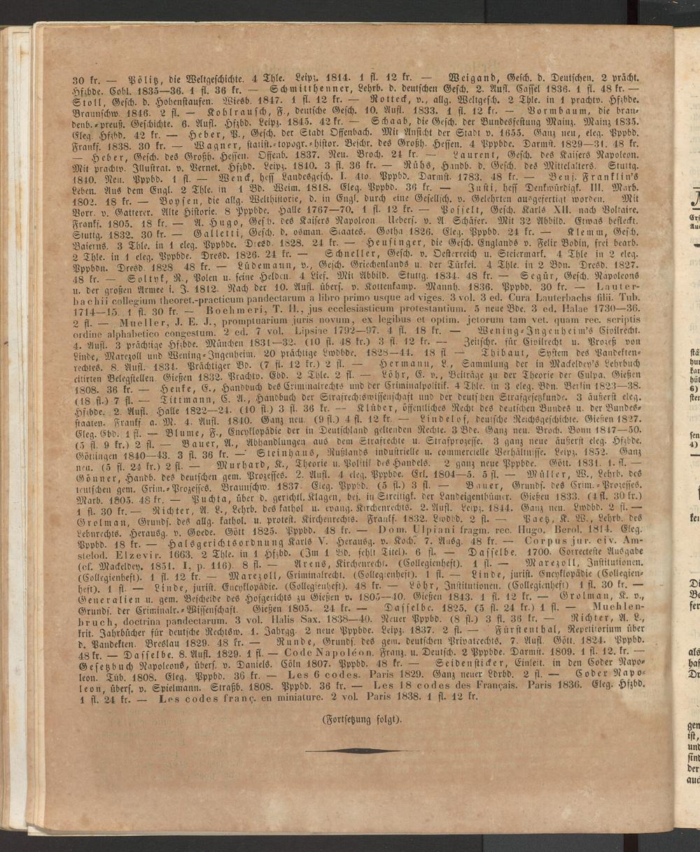 (Collegienheft). 1 fl. 12 fr. — Marezoll, Criminalrechk. (Colleg-enheft). 1 fl. — Linde, jurist. Encyklopädie (Collegien- hep). i fl. — Liir de, jurist. Encyklopädie. (Collegienheft). 48 fr. — Löhr, Institutionen. (Collegienheft) Ist. 30 fr. — Generalien u. gern. Bescheide des Hofgerichts zu Gießen v. 1805—40. Gießen 1843. 1 fl. 12 fr. — Grolman, K. v., Grunds, der Criminalr.-Wissenschaft. Gießen 1805. 24 fr. — Dasselbe. 1825. (5 fl. 24 fr.) 1 (I. Much I en- bruch, doctrina pandectarum. 3 vol. Halis Sax. 1838—40. Neuer Pppbd. (8 fl.) 3 fl. 36 fr. Richter, A. L., krit. Jahrbücher für deutsche Rechtsw. 1. Jahrgg. 2 neue Pppbde. Leipz. 1837. 2 fl. — Fürst ent Hal, Repetitorium über d. Pandekten. Breslau 1829. 48 fr. — Runde, Grunds, des gern, deutschen Privatrechts. 7. Aufl. Gött. 1824. Pppbd. 48fr Dasselbe 8. Aufl. 1829. 1 fl. — Code Napoleon. Franz, u. Deutsch. 2 Pppbde. Darmst. 1809. 1 fl. 12.fr. — Gesetzbuch Napoleons, übers, v. Daniels. Cöln 1807. Pppbd. 48 fr. — Seidensticker, Einleit, in den Coder Napo