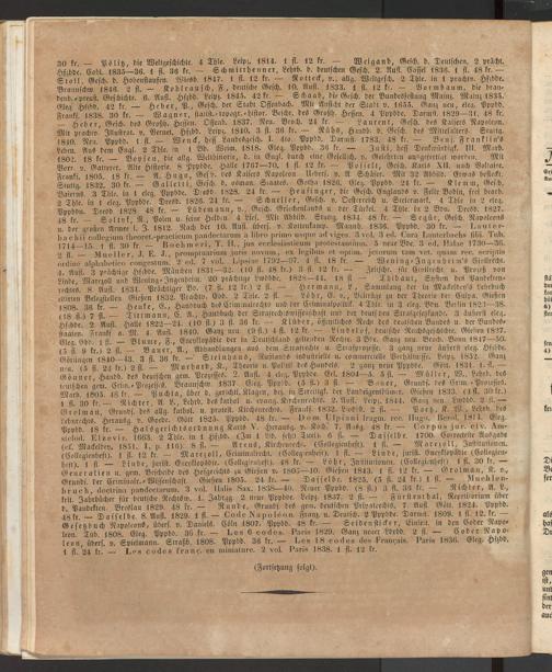 30 fr. — Pölitz, die Weltgeschichte. 4 Thle. Leip;. 1814. 1 fl. 12 fr. — Weigand, Mesch, d. Deutschen. 2 Pracht. Hfchde. Cobl. 1835—36. 1 fl. 36 fr. — Schmitthenner, Lehrb. d. deutschen Gesch. 2. Ausl. Cassel 1836. 1 fl. 48 fr. — Stoll, Gesch. d. Hohenstaufen. WieSb. 1847. 1 fl- 12 fr. — Rotteck, v., allg. Weltgesch. 2 Thle. in 1 prachtv. Hfzbde. Brauns'chw 1846. 2 fl. — Kob krau sch, F>, deutsche Gesch. 10. Aufl. 1833. 1 fl. 12 fr. — Vormbaum, die brandend. -preuß. Geschichte. 6. Aufl. Hfzbd. Leipz. 1845. 42 fr. — Schaab, die Gesch. der Bundesfestung Mainz. Mainz 1835. Cleg. Hfzbd'. 42 fr. — Heber, P., Gesch. der Stadt Offenbach. Mit Ansicht der Stadt v. 1655. Ganz neu, eleg. Pppbd. Franks. 1838. 30 fr. — Wagner, staust.-topogr.-histor. Beschr. des Großh. Hegen. 4 Pppbde. Darmst. 1829—31. 48 fr. — freber Gesch. des Großh. Hessen. Offenb. 1837. Neu. Broch. 24 fr. — Laurent, Gesch. des Kaisers Napoleon. Mit pracktv.' Jllustrat. v. Bernet. Hfzbd. Leip;. 1840. 3 fl. 36 fr. — Rühs, Handb. d. Gesch. des Mittelalters. Stultg. 1840. Neu. Pppbd. 1 fl. — Wenck, Hess Lanbesgesch. J. 4to. Pppbd. Darmst. 1783. 48 fr. — Bens. Franflin's eebett Aus dem Engl. 2 Thle. in 1 Bd. Weim. 1818. Cleg. Pppbd. 36 fr. — Iuffi, Hess Denfwürdigf. III. Marb. 1802. 18 fr. Boysen, die allg. Welthiftorie, d. in Engl. durch eine Gesellsch. v. Gelehrten ausgefertigt worden. Mit Bvrr.'v. Gatterer. Alte Historie. 8 Pppbde. Halle 1767—70. 1 fl. 12 fr. — Posselt, Gesch. Karls XII. nach Voltaire. Fronff. 1805. 18 fr. A. Hugo, Gesch. deö Kaisers Napoleon. Uebers. v. A. Schäfer. Mit 32 Abbild. Etwas befleckt. Stuttg. 1832. 30 fr. — Galletti, Gesch. d. osman. Staates. Gotha 1826. Eleg. Pppbd. 24 fr. — Klemm, Gesch. Baierns. 3 ^Thle. in 1 eleg. Pppbde. Dresd. 1828. 24 fr. — Heusinger, die Gesch. Englands v. Felir Bodin, frei bearb. 2 Thle. in 1 eleg. Pppbde. Dresd. 1826. 24 fr. — Schneller, Gesch. v. Oesterreich u. Steiermark. 4 Thle in 2 eleg. sßppbön. Dresd 1828 48 fr. — Lüdemann, v., Gesch. Griechenlands u. der Türkei. 4 Thle. in 2 Bdn. Dresd. 1827. 48 fr- Svltyk, R., Polen u. seine Helden. 4 Lief. Mil Abbild. Stuttg. 1834. 48 fr. — Segür, Gesch. Napoleons u. der großen Armee'i. I. 1812. Nach der 10. Aufl. übers, v. Kotteukamp. Manul). 1836. Pppbd. 30 fr. — La ui er- b'achii coller-ium theoret.-practicum pandectarum a libro primo usque ad viges. 3 vol. 3 ed. Cura Lauterbachs fdii. Tub. ^214 15 i 30 fr. Boehm eri, T. 11., jus ecclesiasticum prötestantium. 5 neue Bde. 3 ed. Halae 1730—36. 9 fl Mueller J. E. J., promptuariurn juris novum, ex legibus et oplim. jctorum tarn vet. quam rec. scriptis ordine alphabetico congcstum’ 2 ed. 7 vol. Lipsiae 1792—97. 4 fl. 18 fr. — ' Wening-Jngcnheim's Civilrecht. 4. Aufl. 3 prächtige Hfzbde. München 1831—32. (10 fl. 48 fr.) 3 fl. 12 fr. — Zeiifchr. für Civilrecht u. Prozeß von Linde' Warezoll und Wening-Jugenheim. 20 prächtige Lwdbde. 1828—44. 18 fl — Thibaul, System des Pandektenrechtes. 8 Aufl. 1834- Prächtiger Bd. (7 fl. 12 fr.) 2 fl. — Hermann, L., Sammlung der in Mackeldey's Lehrbuch citirten Belegstellen. Gießen 1832. Prachtv. Ebd. 2 Thle. 2 fl. — Löhr, E. v., Beiträge zu der Theorie der Culpa. Gießen 1808. 36 fr. H euke, E., Handduch des Criminalrechts und der Crimiualpolitik. 4 Thle. in 3 eleg. Bdn. Berlin 1823—38. (18 fl.) 7 fl. — Titt mann, C. Ä., Handbuch der Strafrechtswissenschaft und der deutschen Strafgesetzkunde. 3 äußerst eleg. chrschde. 2 Aufl. chsalle 1822—24. (10 fl) 3 fl. 36 fr. — Kl über, öffentliches Recht des deutschen Bundes u. der Bundesstaaten'. Franks a/M. 4. Aufl. 1840. Ganz neu. (9 fl.) 4 fl. 12 fr. — Liirdelof, deutsche Reichsgeschichte. Gießen 1827. Eleg. Ebd. 1 fl. — Blume, F., Encyklopädie der in Deutschland geltenden Rechte. 3 Bde. Ganz neu. Broch. Bonn 1817—50. 0 fl' 9 2 fl. Bauer, A., Abhandlungen aus dem Strafrechte u. Strafprozesse. 3 ganz neue äußerst eleg. Hfzbde.