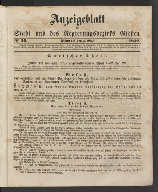 1) Gesetz, ras öffentliche und mündliche Verfahren bei den vor die Provinzialstrafgerichte gehörigen Sachen in den Provinzen Starkenburg und Ober- heffen betr.; — Bekanntmachung, die Entlastung der 2. Aufgebote der Militärpflichtigen von den Jahren 1849 und 1850 betr.