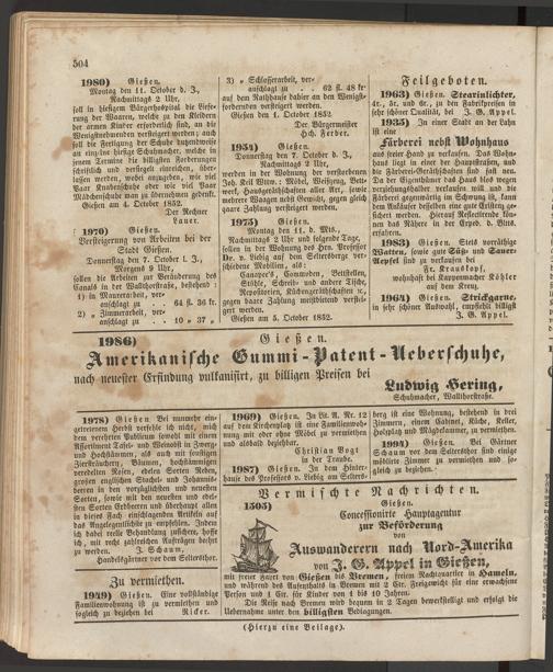 mit freier Faprt von Gießen bis Bremen, freiem Nachtquartier m Hameln, und während des Aufenthalts in Bremen mit 2 Ctr. Freigewicht für eine erwachsene Person und 1 Ctr. für Kinder von 1 bis 10 Jahren.