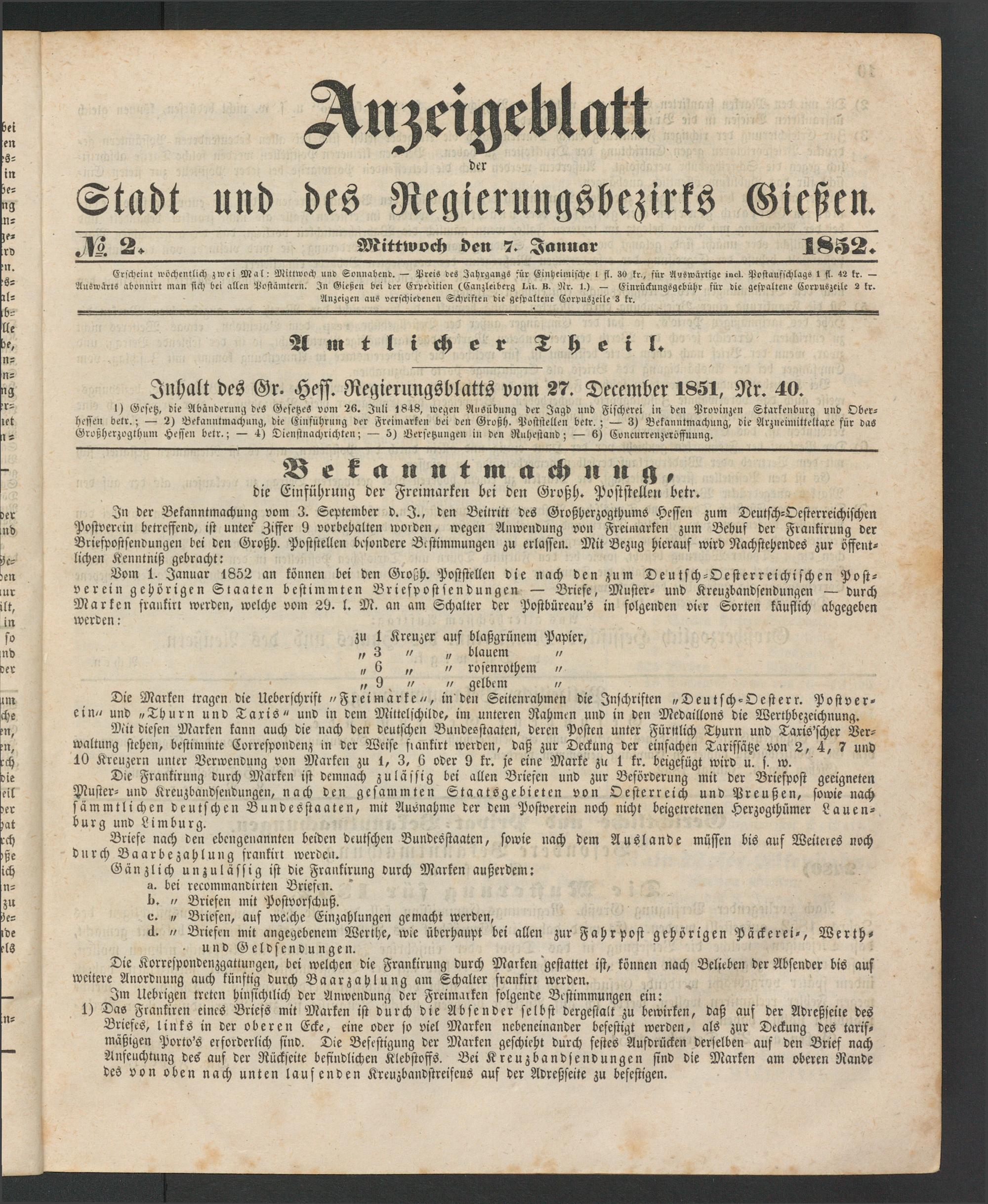 Bom 1. Januar 1852 an können bei den Großh. Poststellen die nach den zum Deutsch-Oesterreichischen Postverein gehörigen Staaten bestimmten Briespostsendungen — Briefe, Muster- und Kreuzbandsendungen — durch Marken frankirl werden, welche vom 29. l. M. an am Schalter der Postbüreau's in folgenden vier Sorten käuflich abgegeben werden: