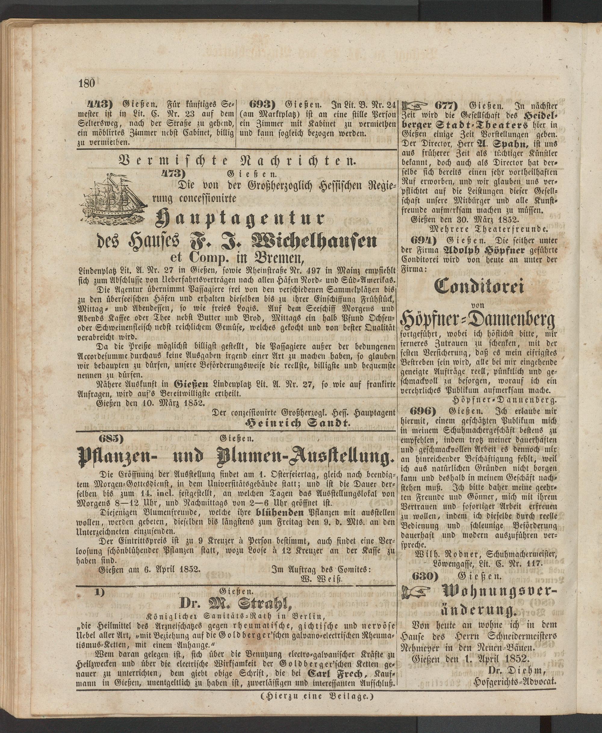 Liudenplatz Lit. A. Nr. 27 in Gießen, sowie Rheinstraße Nr. 497 in Mainz empfiehlt sich zum Abschlüsse von UeberfahrtSverträgen nach allen Häfen Nord- und Süd-Amerikas. Die Agentur übernimmt Passagiere frei von den verschiedenen Sammelplätzen bis