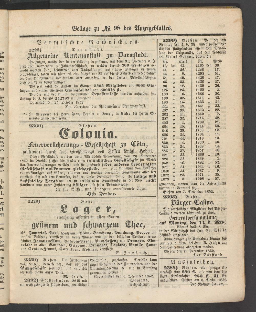 23S4L) Gießen. Von hiesiger Armenkasse sind 890 st. und von dem hiesigen Kirchenkasten 280 fL 31 kx. auszuleihen. Gießen am 6. Deebr. 1852.