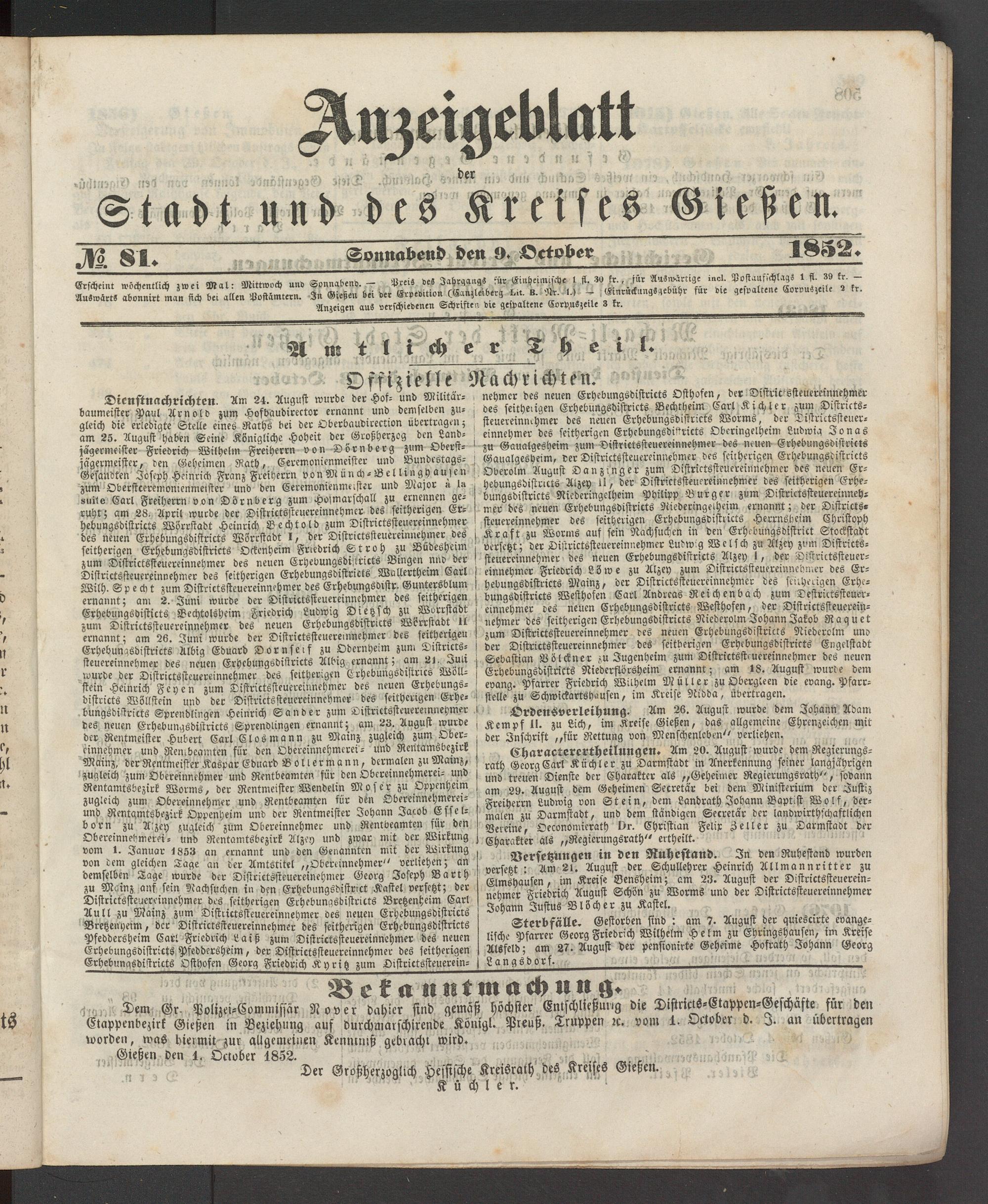 Dem Gr Polizci-Eommissär Nover dahier sind gemäß höchster Entschließung die Districls-Oappcn-Geschafte für den Etappenbezirk Gießen in Beziehung auf durchmarschirende Königl. Preuß. Truppen re. vom 1. Dctober d. J. an übertragen worden, was hiermit zur allgemeinen Kennliuß gebracht wird.