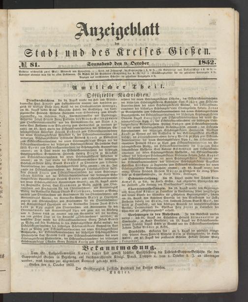 Gießen den 1. October 1852.